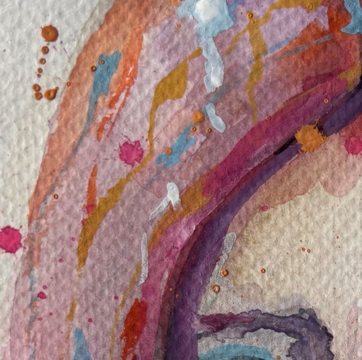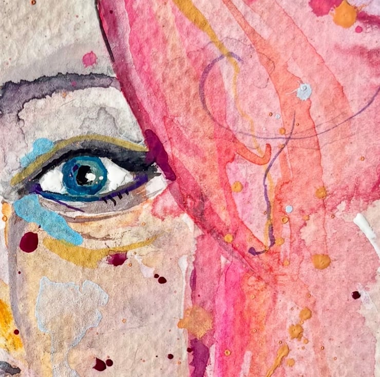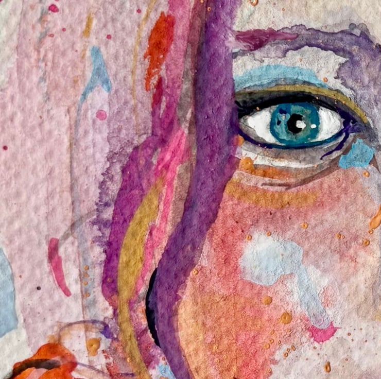 Colourful portrait of a women with flowers - a mix between graphic art and traditional watercolour with paint splats and drips. On quality watercolour paper. Ready to be framed. Will add a burst of colour to any room.