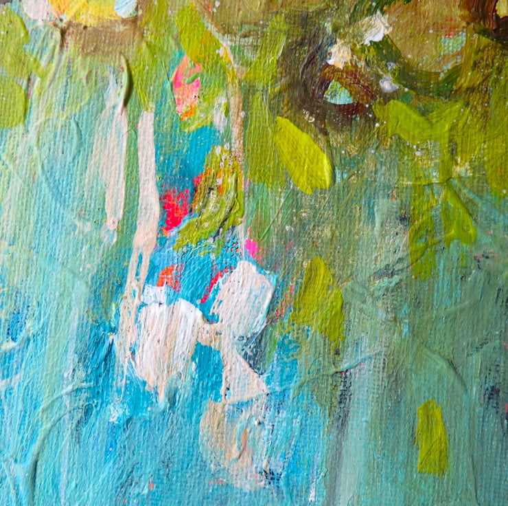 This piece is all about contrast and energy, I've layered cool blues, with soft zesty lime greens to create a sense of freshness, then highlighted the scene with hot, vibrant pops of colour. To keep the piece feeling light and airy, I've added loose, expressive mark-making, these intuitive strokes that capture the imagination.