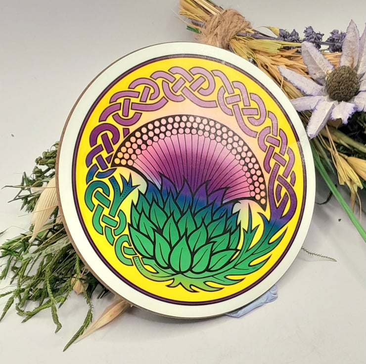 This is a gorgeous hardbacked 3mm thick Coaster featuring an original design of a Celtic Knot inspired Thistle, designed by hand by myself in ink, scanned and coloured in photoshop, then sent off to be printed professionally.