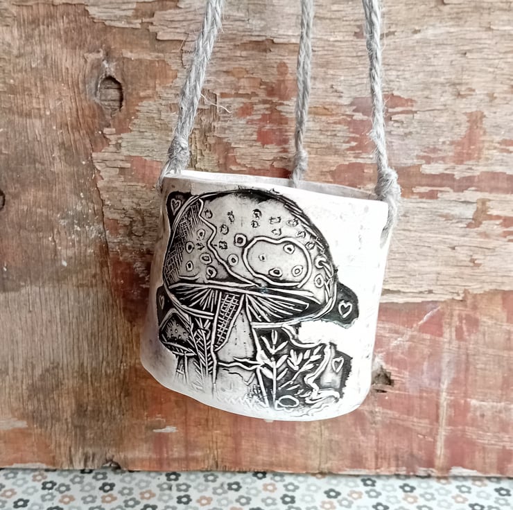 toadstool watercolour handmade plant pot ceramic pottery stoneware, hanging planter lilac black white