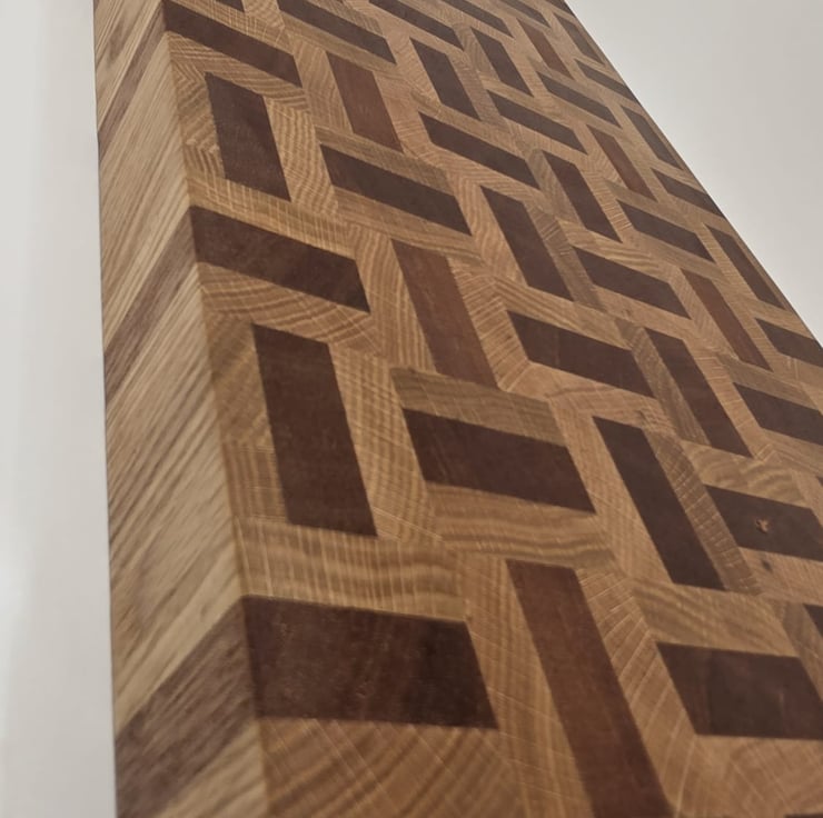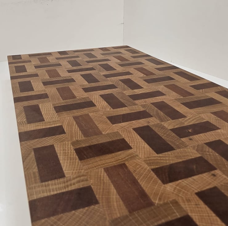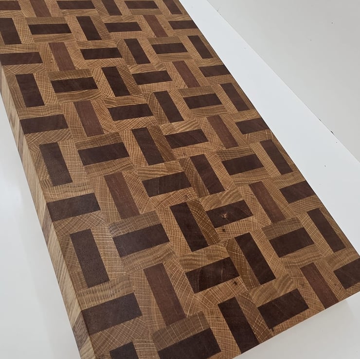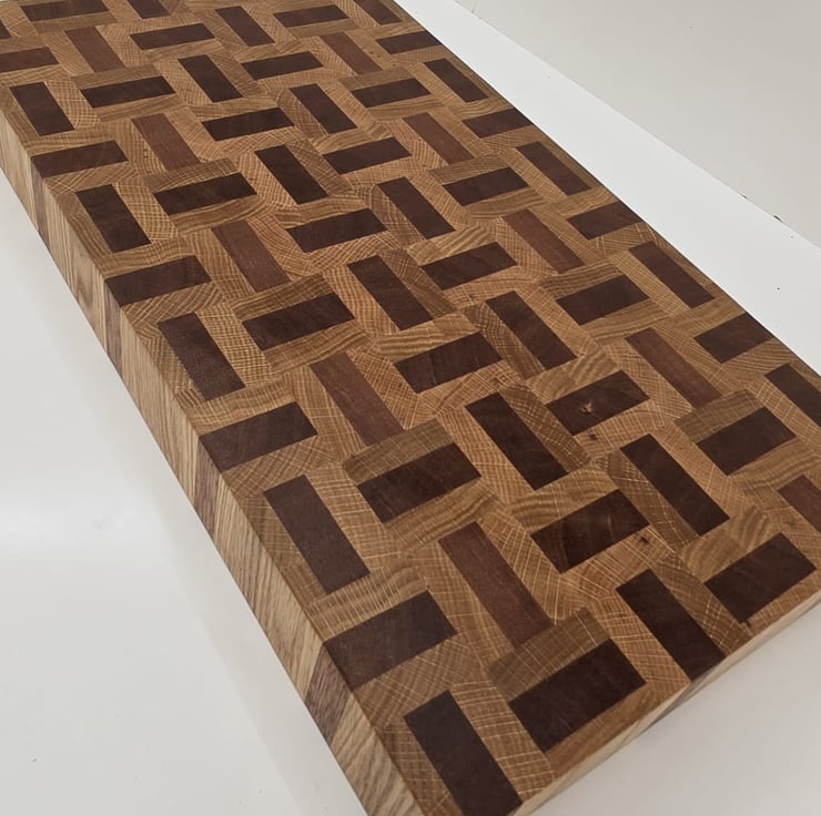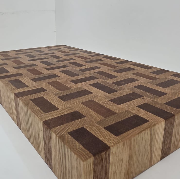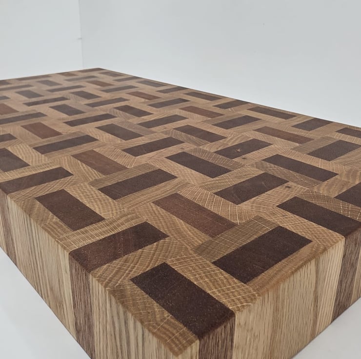 Handcrafted from a combination of meranti and oak, this end grain chopping board features a distinctive basket weave pattern that highlights the natural contrast between the two hardwoods.