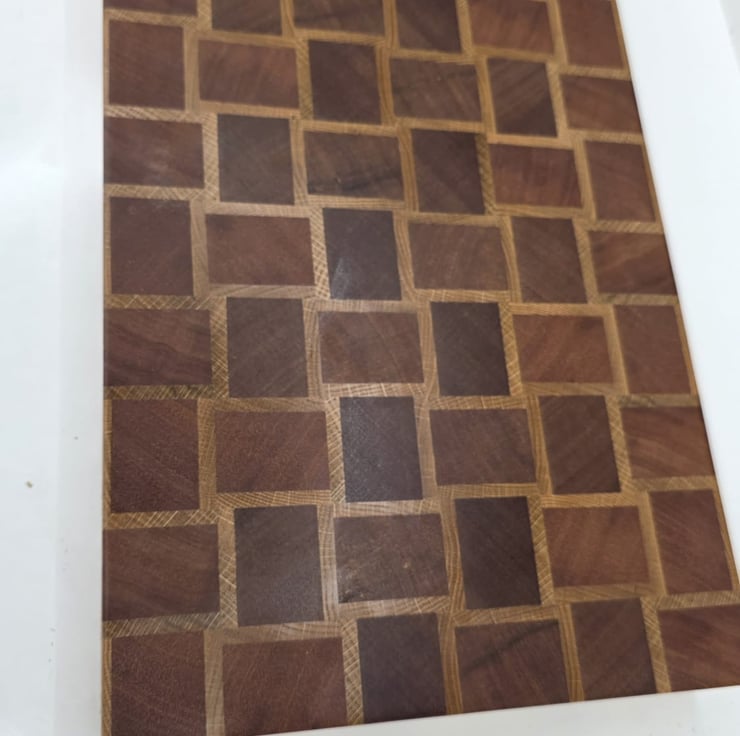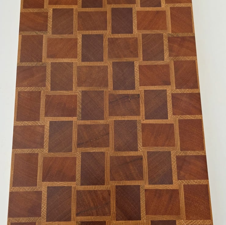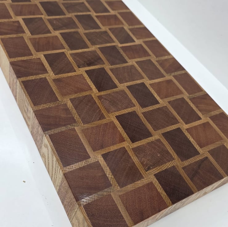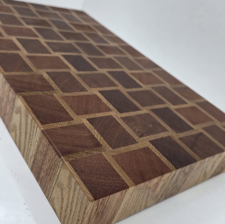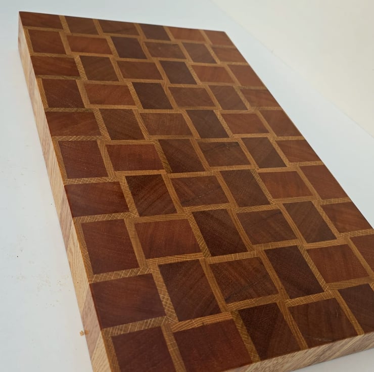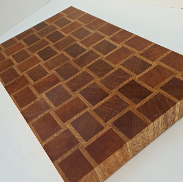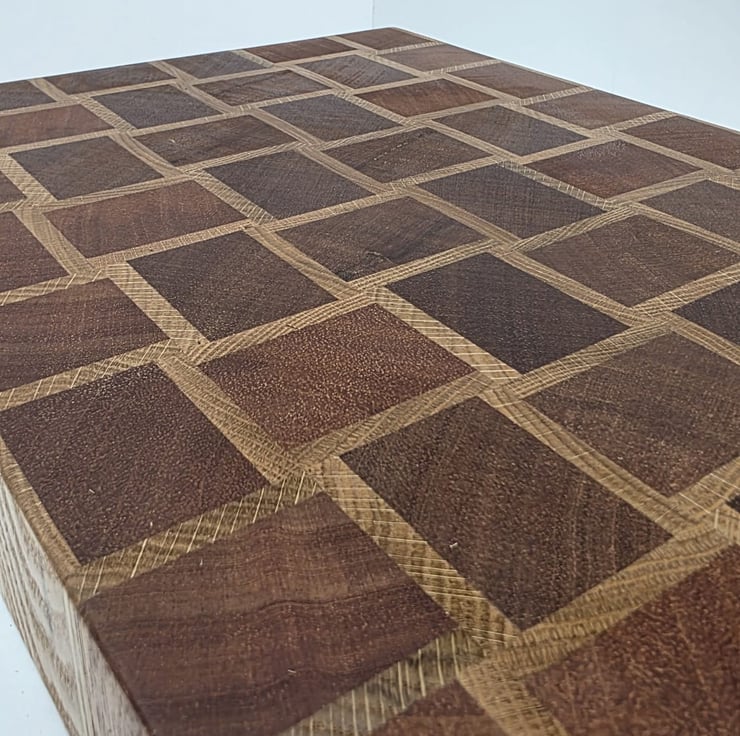 This handmade end grain chopping board features a basket-style pattern created from carefully selected meranti and oak hardwoods.