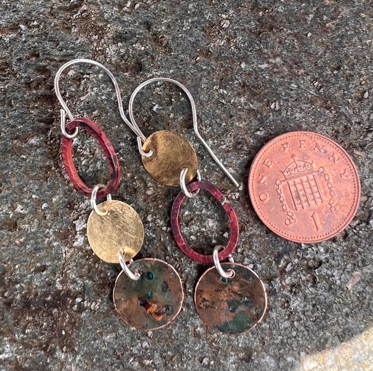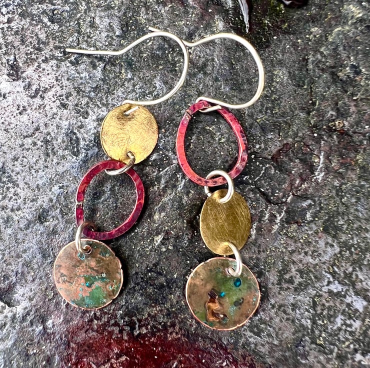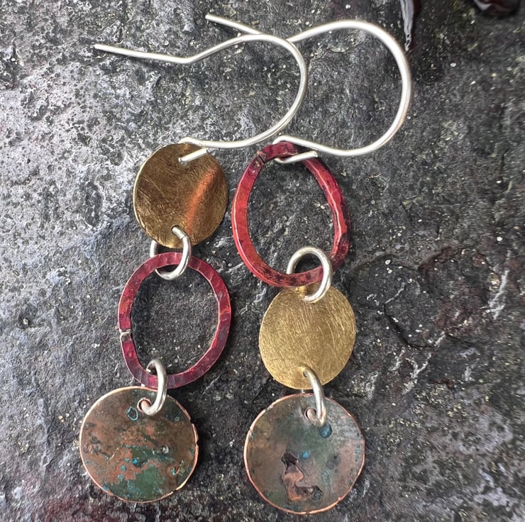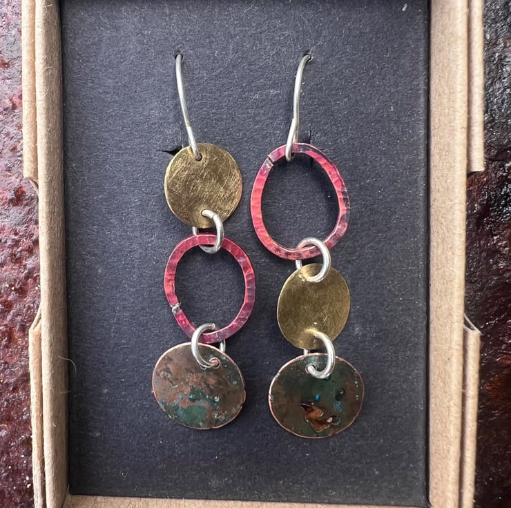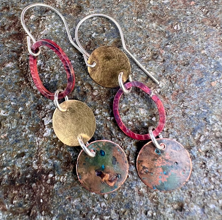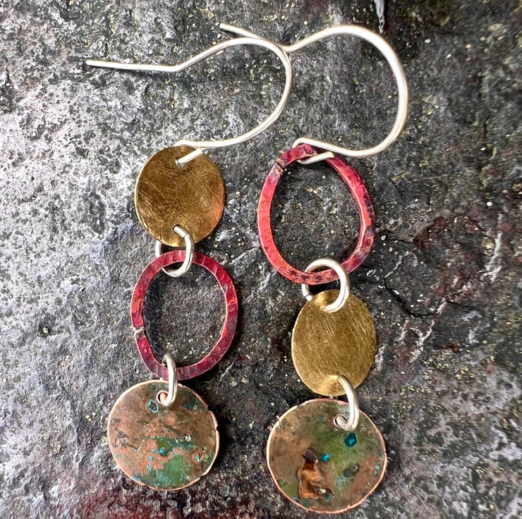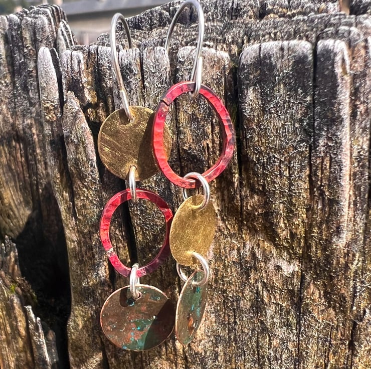 Brass , verdigris and copper circular shapes hung together with contrasting colours and textures to make a pair of mismatched long dangle earrings . The deep red colours are achieved with heat on the copper oval shaped , which are hammered to give some texture copper . The bottom pieces have undergone a verdigris process.