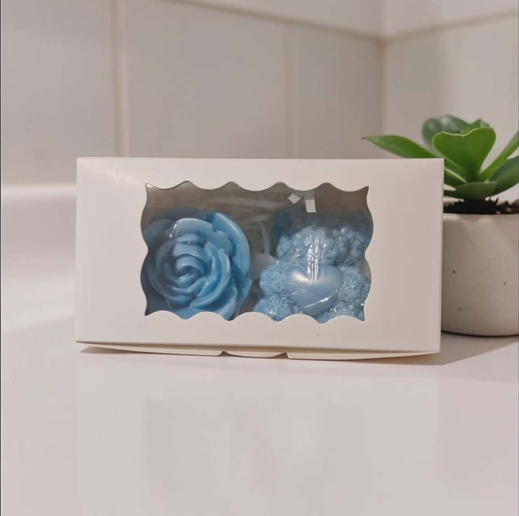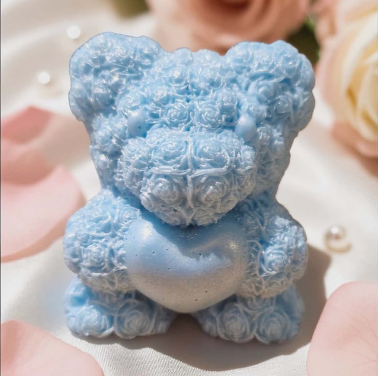 A beautifully handcrafted Teddy Soap Gift Set, featuring a rose textured teddy holding a glossy heart, paired with a matching rose and presented in a gift box. This 120g set makes a perfect treat for yourself or a thoughtful gift for someone special. Gentle on the skin, rich in nourishing oils, and designed to look as lovely as it smells.