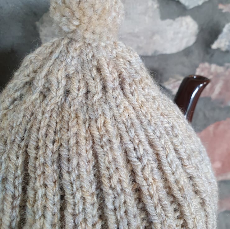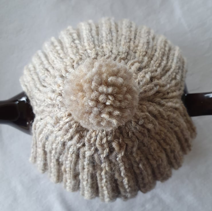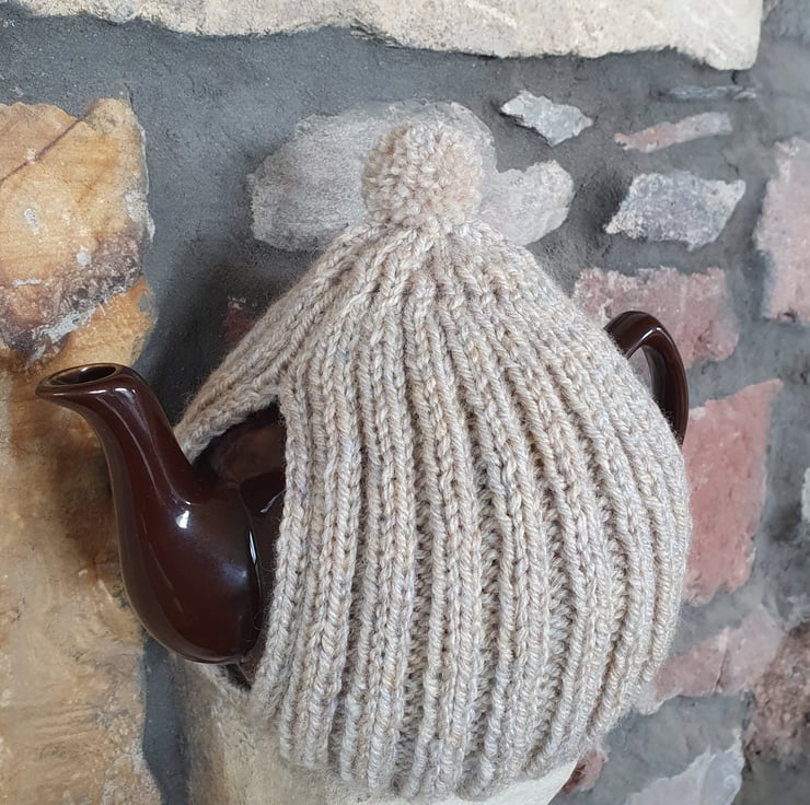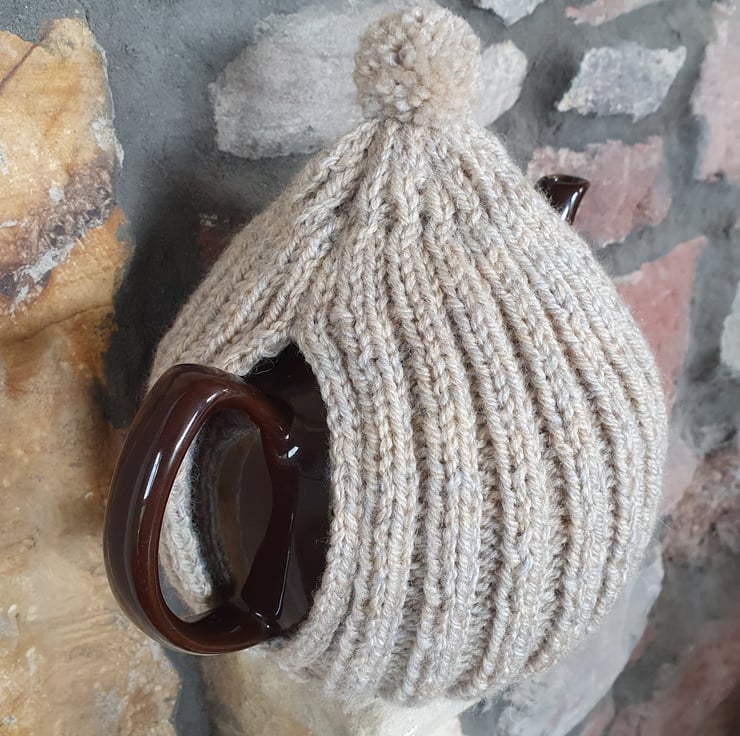 Large hand knitted tea pot cosy, knitted in Aran weight, wool mix yarn, 20% Wool, 80% Acrylic. The 2 x 2 rib makes the cosy thick but also stretchy. Machine washable. The design of this cosy combines tradition and up to the minute contemporary design.