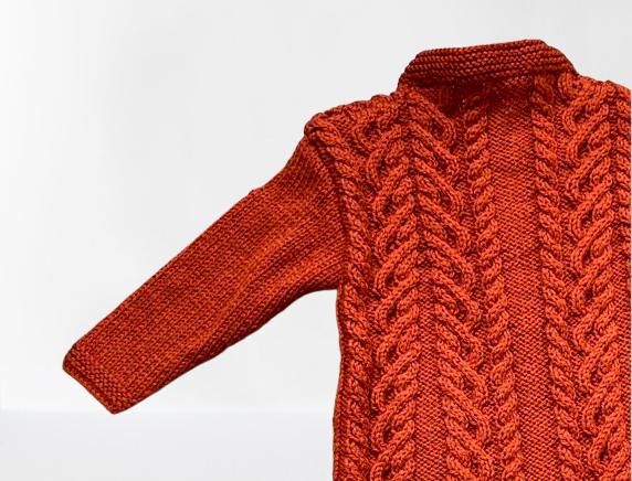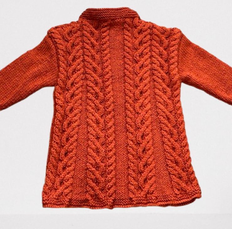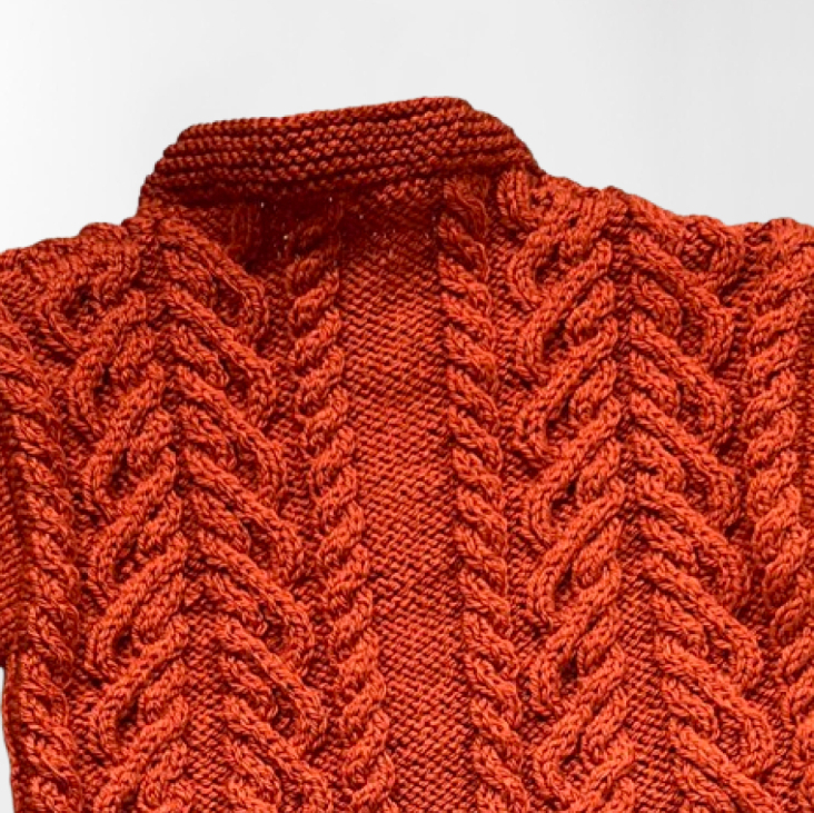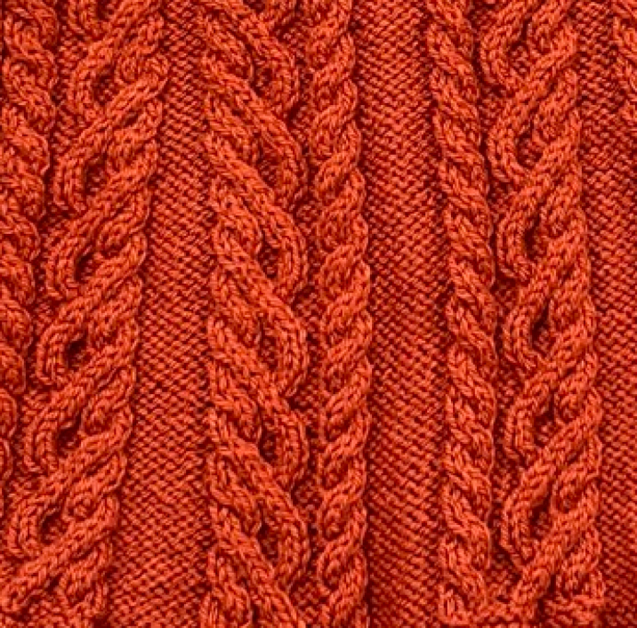 Cable Pattern to both fronts and back with reverse stocking stitch to each side of the cable panels - stocking stitch to the set in sleeves and garter stitch to the round neck, lower edge and sleeve cuffs