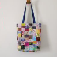 Upcycled cotton patchwork tote bag with long handle (A).