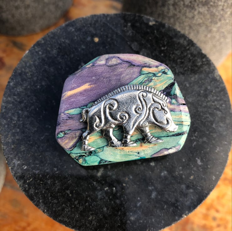 Compressed heather stems with pewter Pictish boar.
