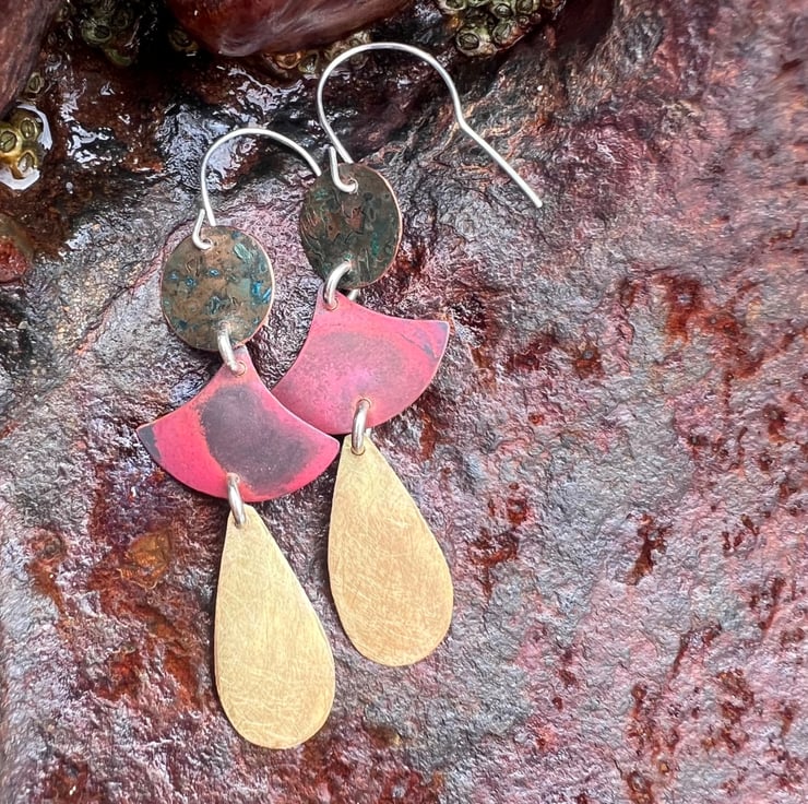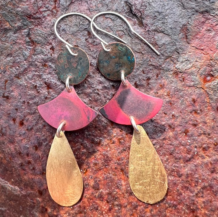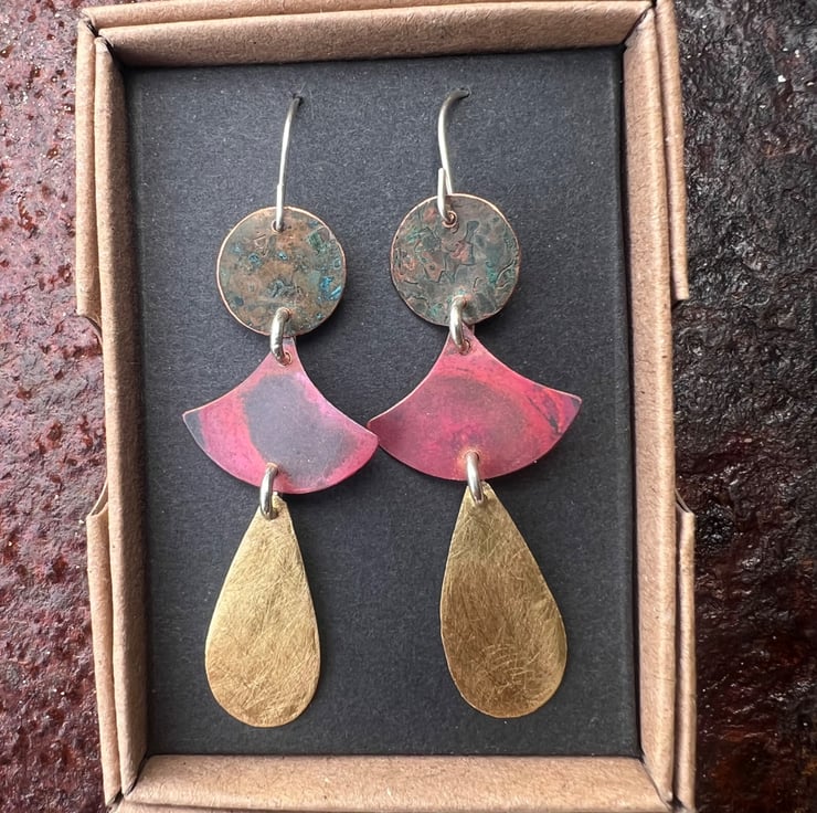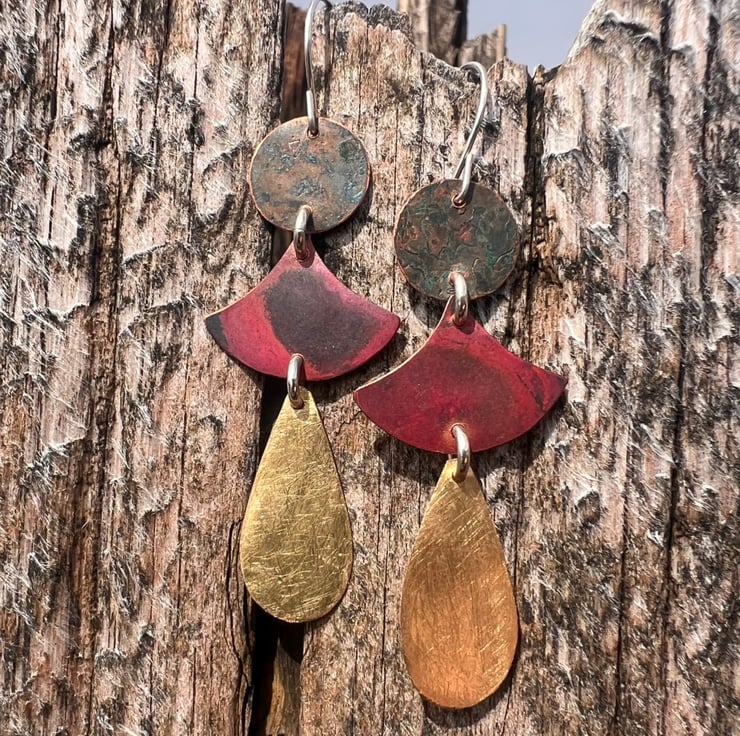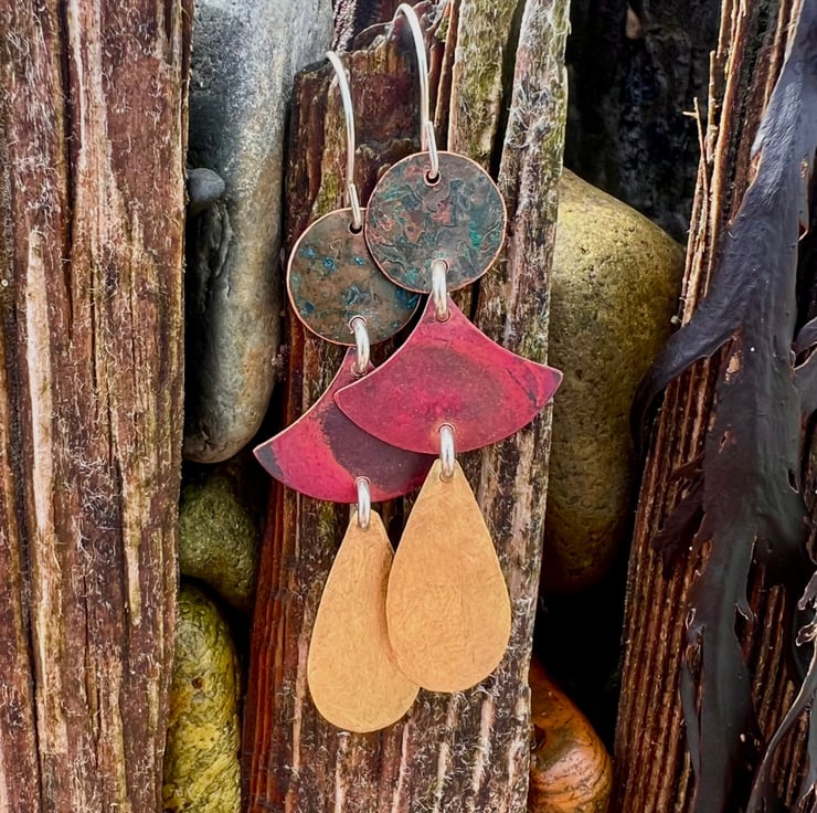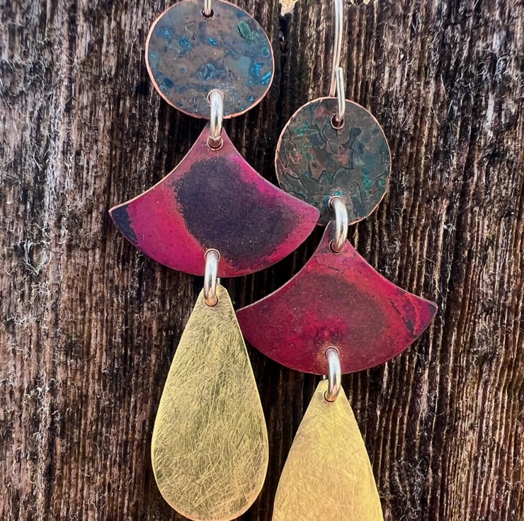 Brass , verdigris and copper circular shapes hung together with contrasting colours and textures to make a pair of long dangle statement earrings . The deep red colours are achieved with heat on the copper. The top pieces have undergone a verdigris process.