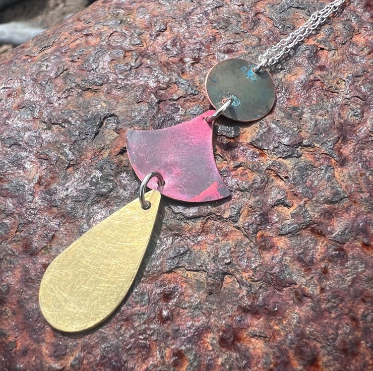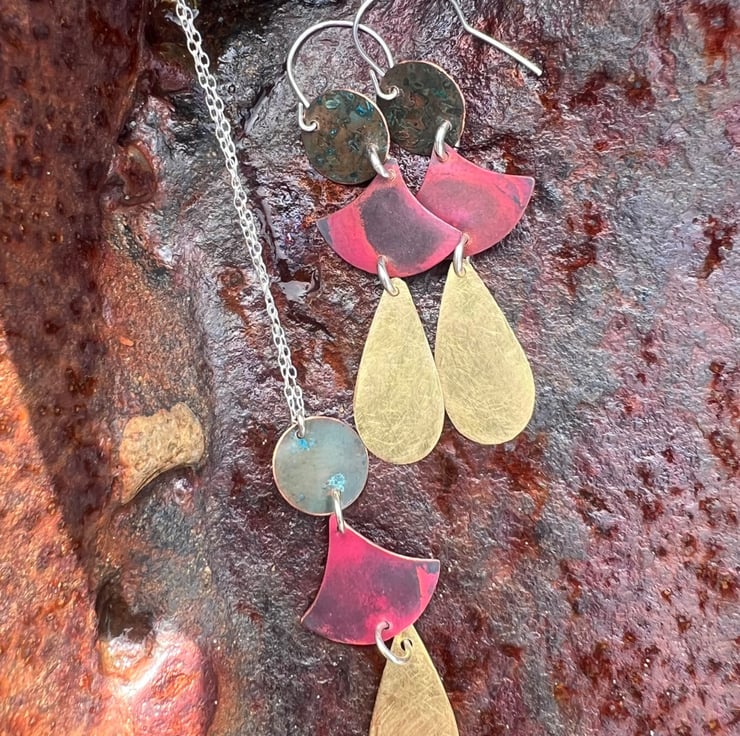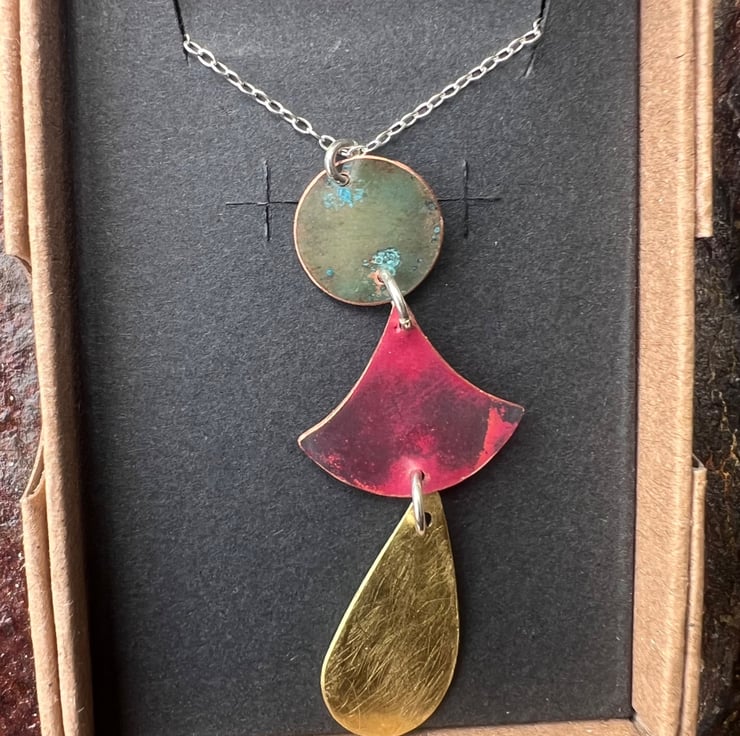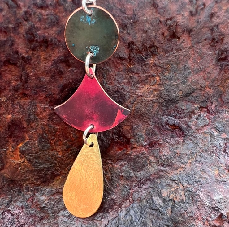 Brass , verdigris and copper shapes hung together with contrasting colours and textures. The deep red colours are achieved with heat. The top piece has undergone a verdigris process.