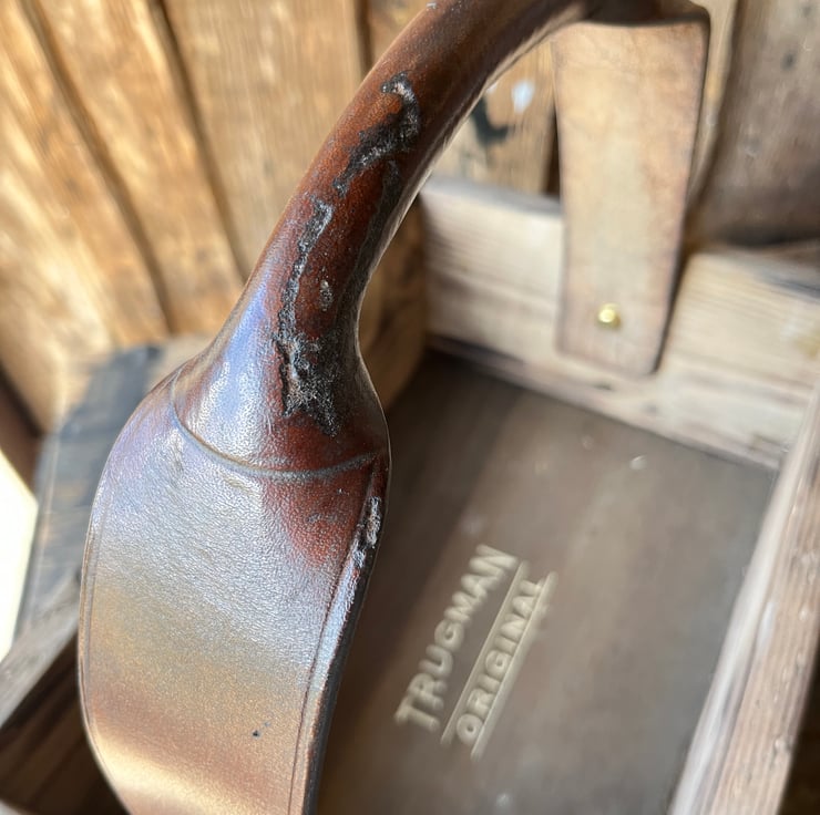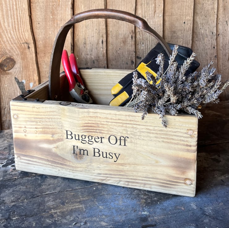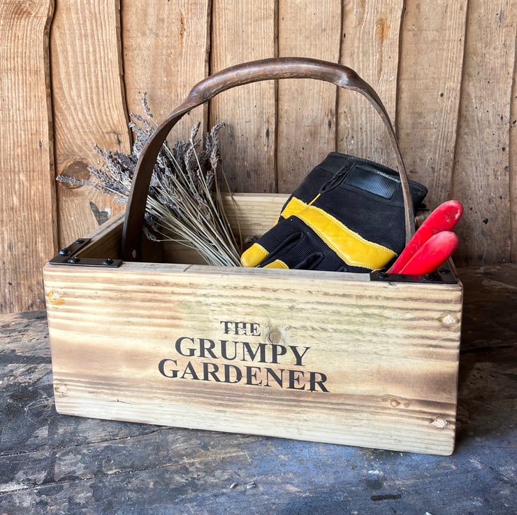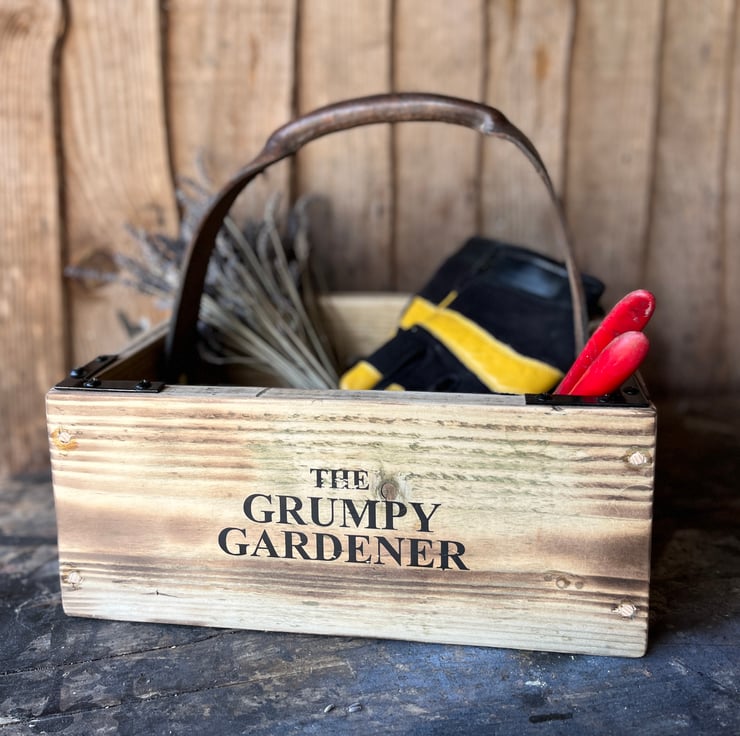 Made from recycled wood, singed with a blow torch, battered and scarred. It's had its own particular beauty. The leather handle equally has a battered beauty and deep rich patina. Brass fittings and black corner pieces really set it off. This is a perfect gift for The Grumpy Gardener