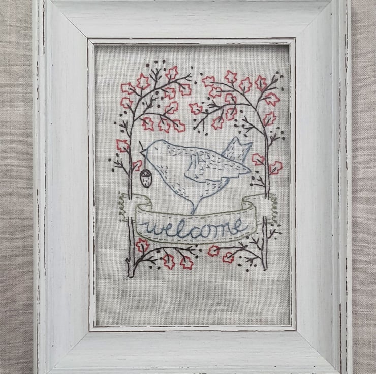 This beautiful picture is hand embroidered and mounted and framed in a decorative ivory painted frame measuring 21 x 16 cms