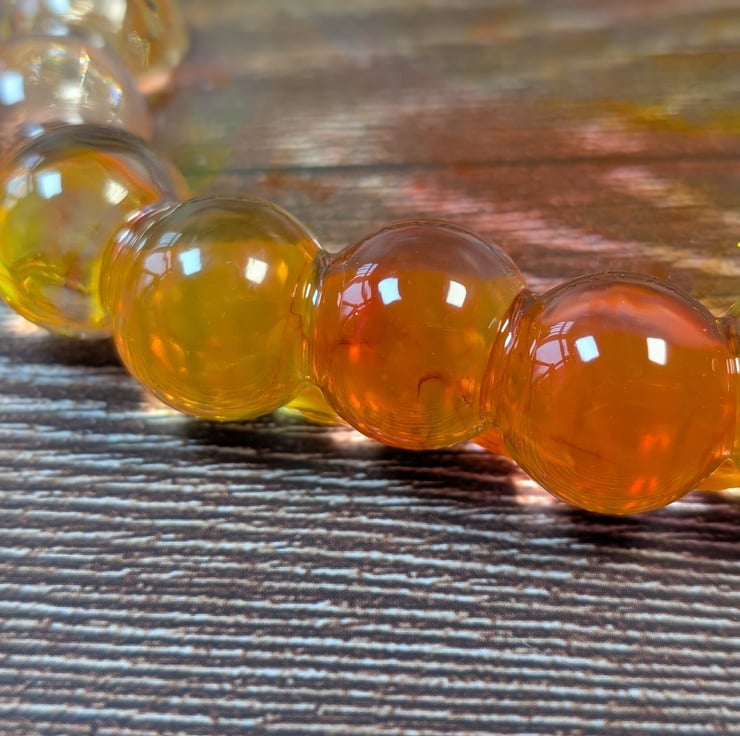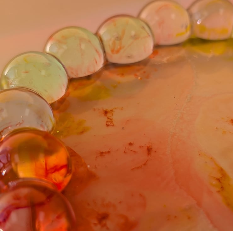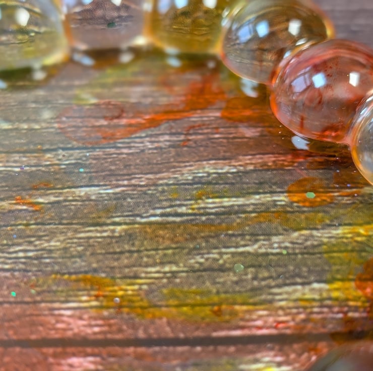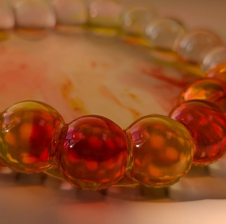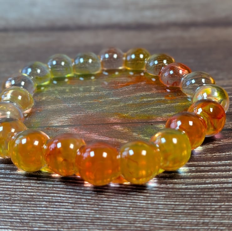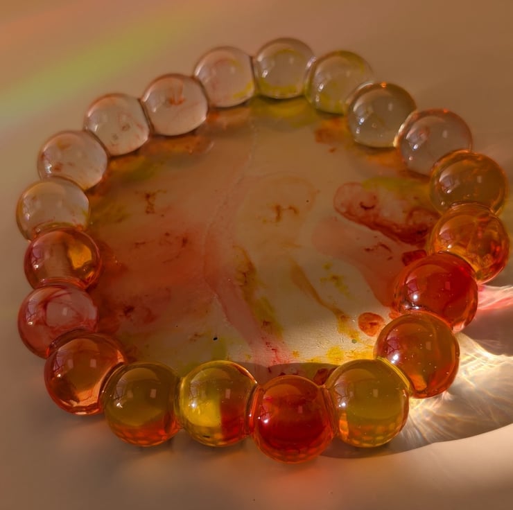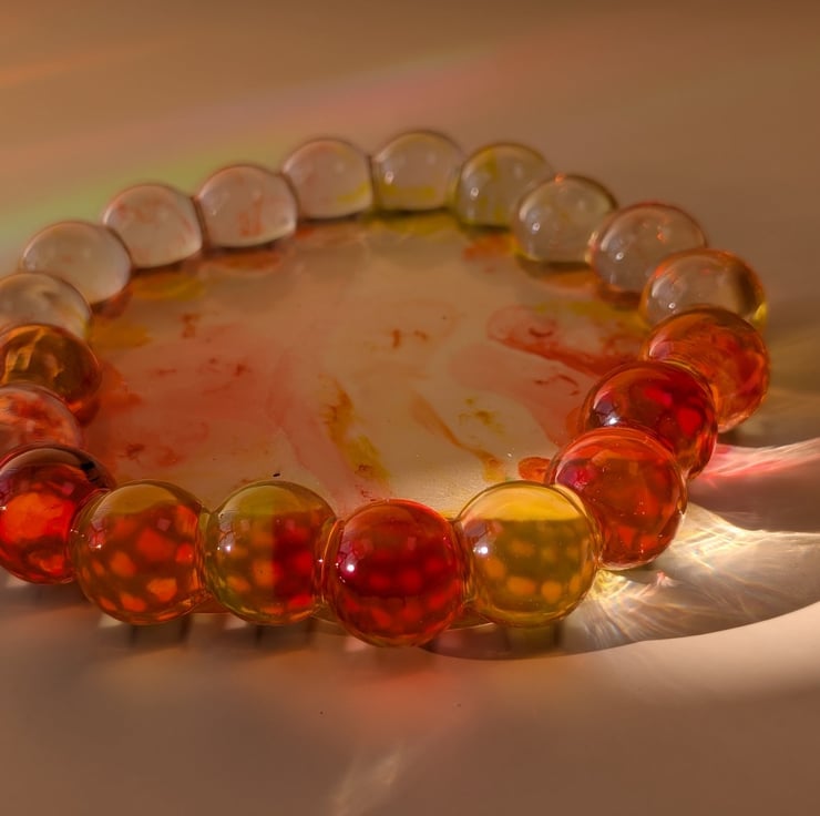 A bright, warm resin tray with a translucent orange-to-yellow bloom in the centre and a glossy bubble edge. The colours shift depending on the light, giving it a soft floral look with subtle veining and depth. Finished smooth and sturdy, ideal for jewellery, keys, small decor, or desk items.