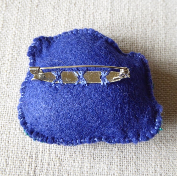 Wool roving in blended blue colour shades felted onto a royal blue base felt sheet then hand embroidered to create a textured art piece for you to enjoy wearing.