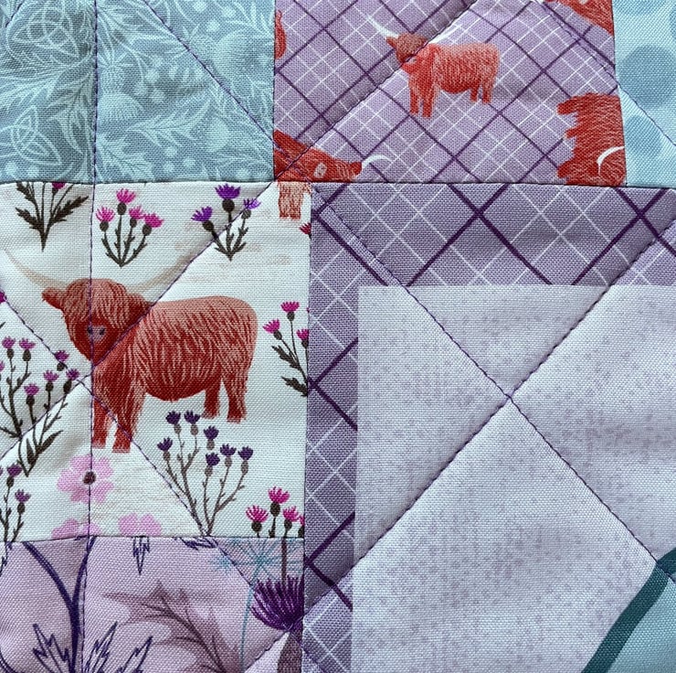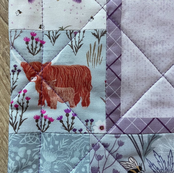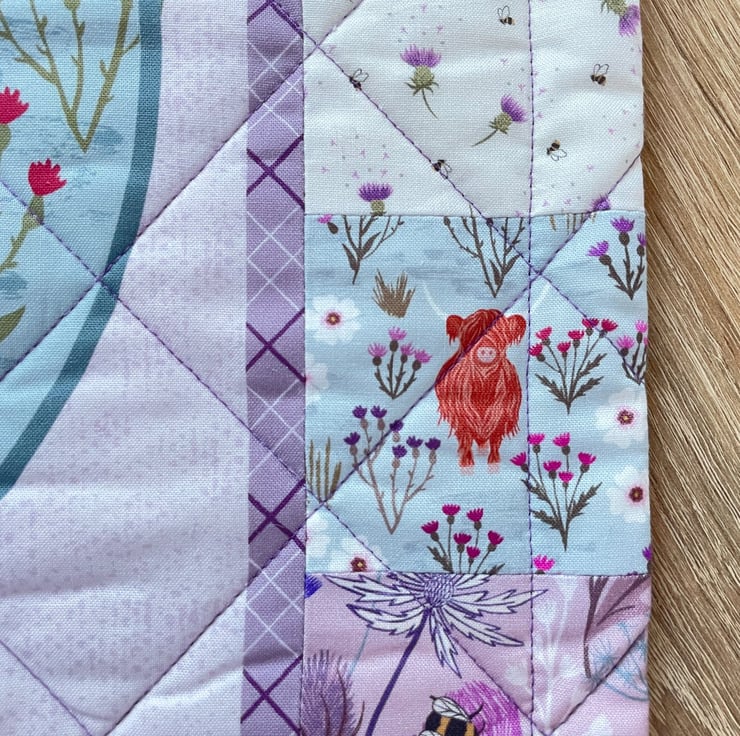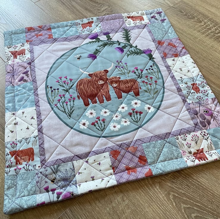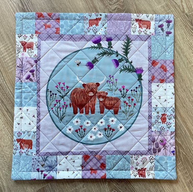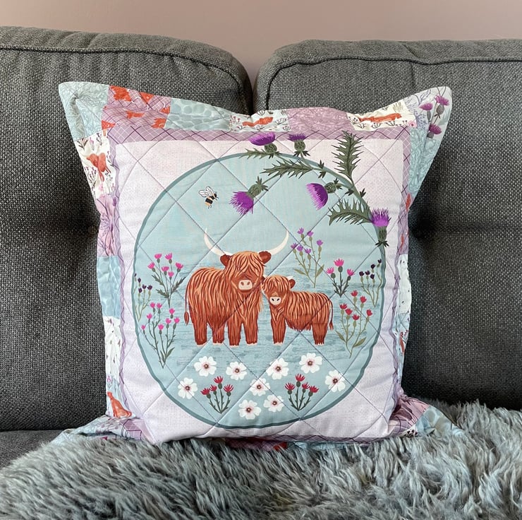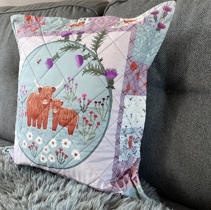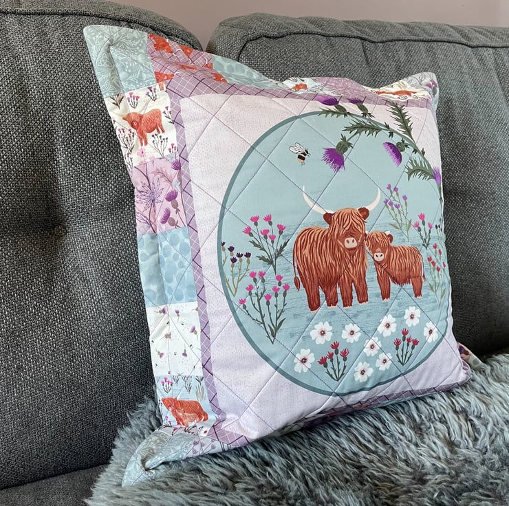 Quilted cushion cover featuring charming Highland cows, crafted from beautiful fabrics in the Lewis & Irene Celtic Summer collection.