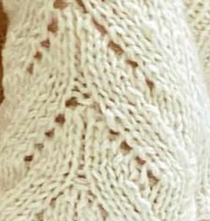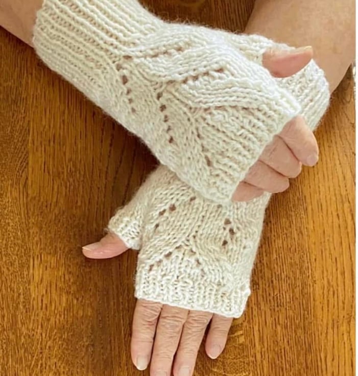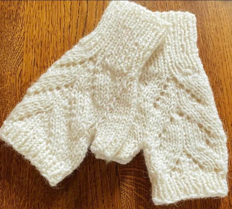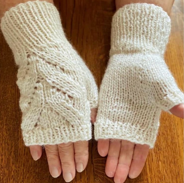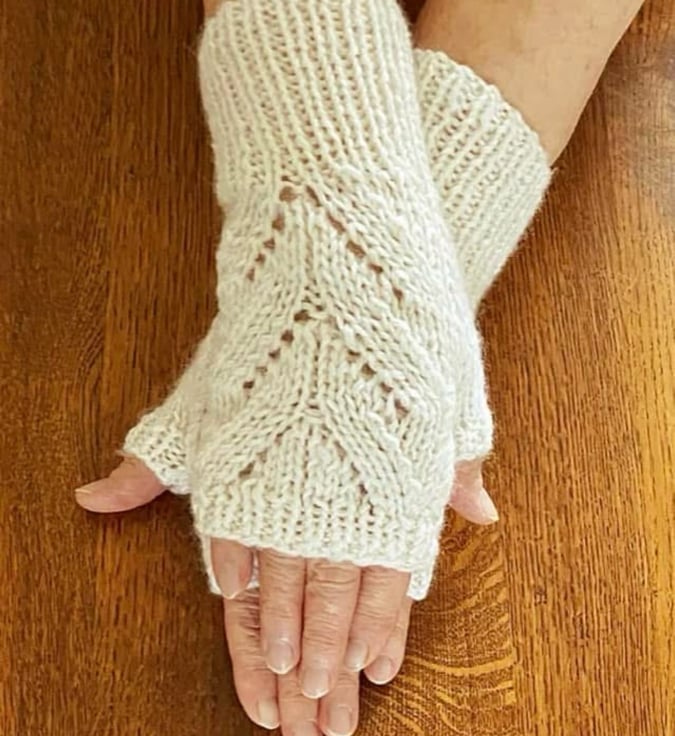 Hand Knitted Fingerless Mittens in a Cream Coloured 8 ply Merino Wool with leaf design.