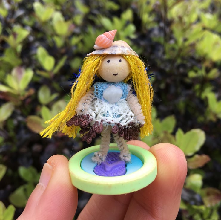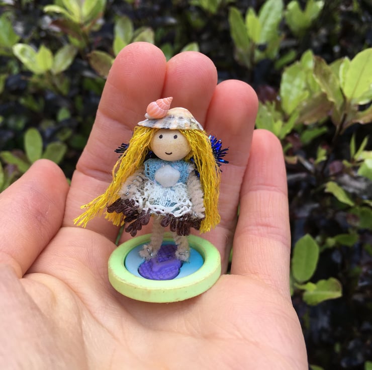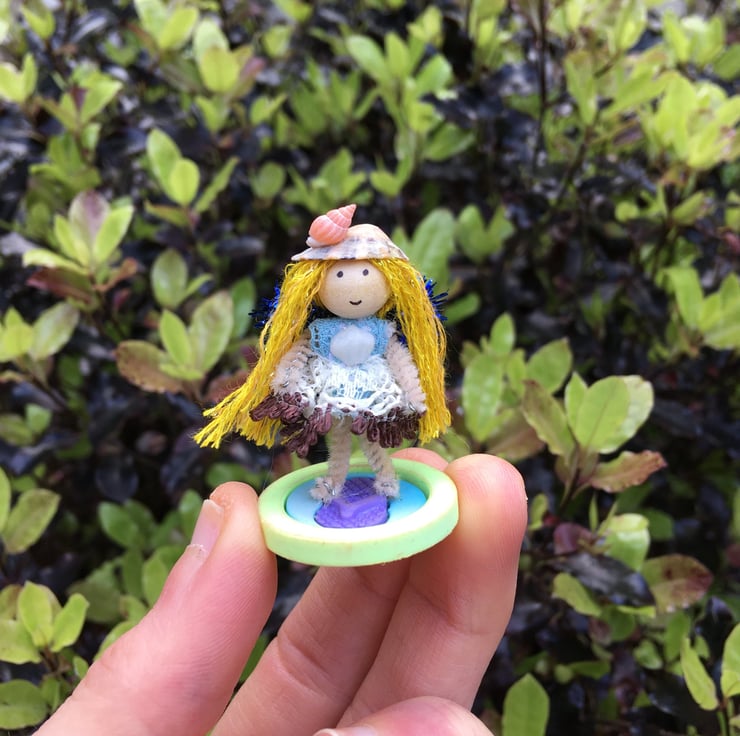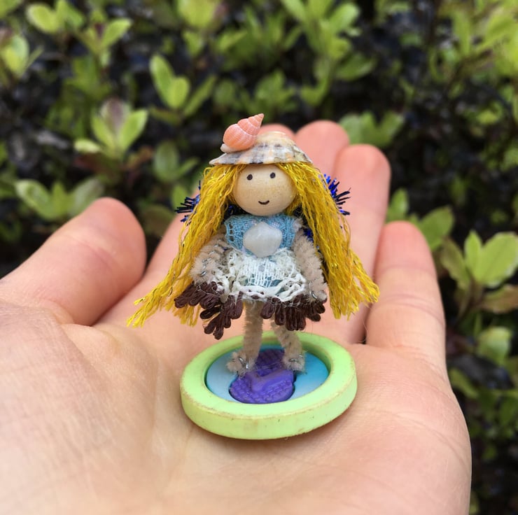 She has a pipe cleaner body, wooden bead head with carefully hand draw features, a lace dress and sparkly embroidery thread hair.