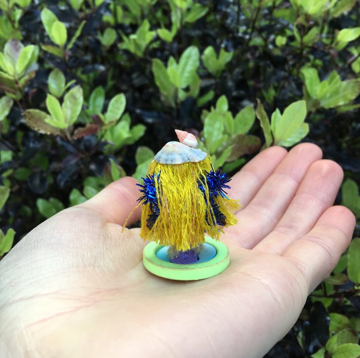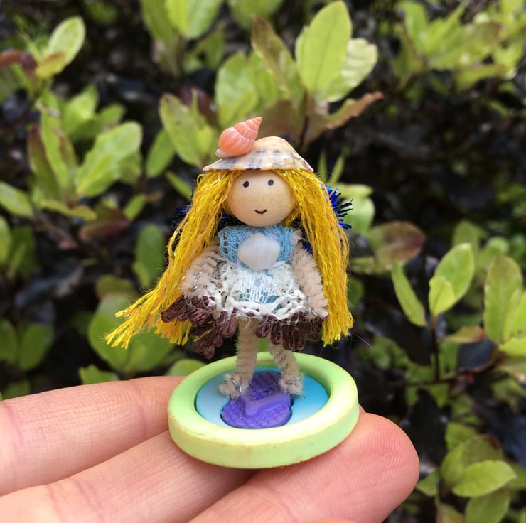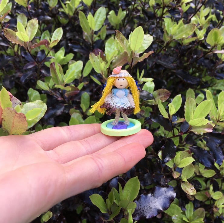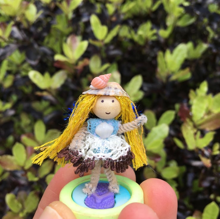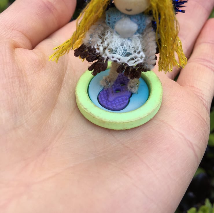 The tiny fairy is stood on a button with a flip flop design on.