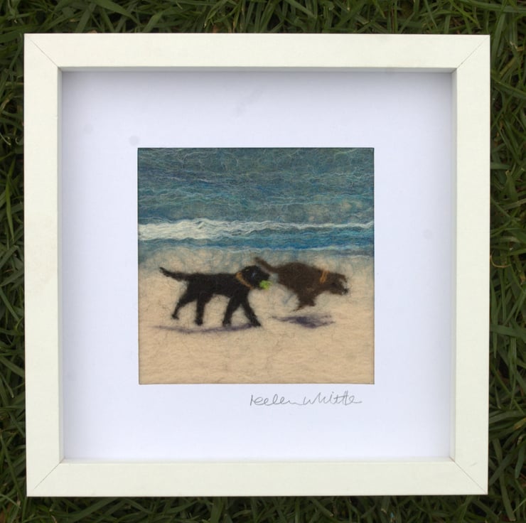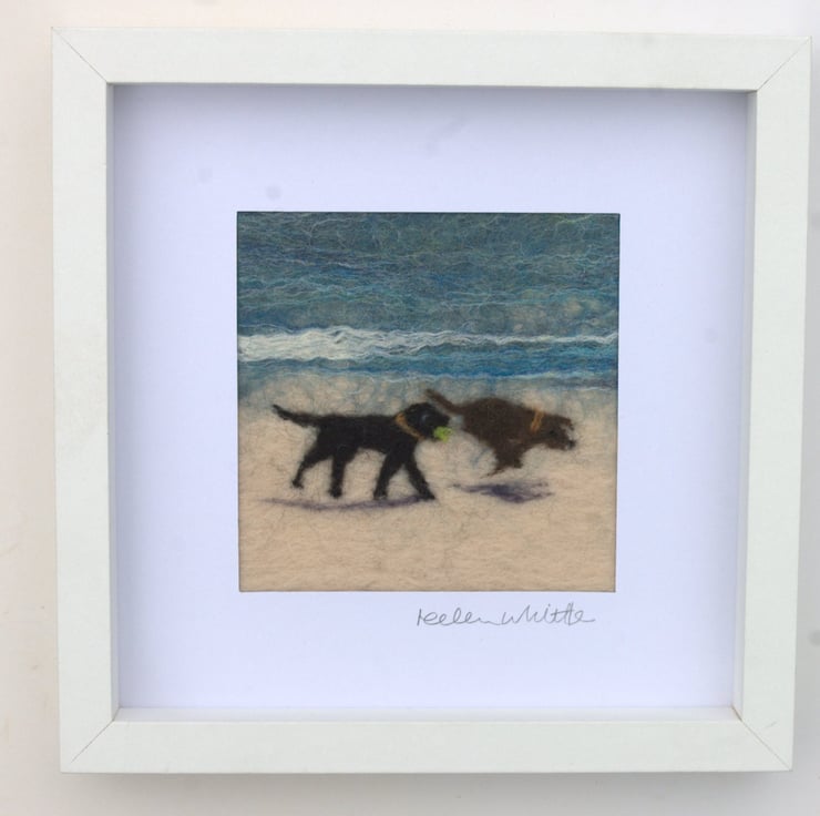 Original felted art of two dogs having fun on a beach, one carrying a tennis ball.