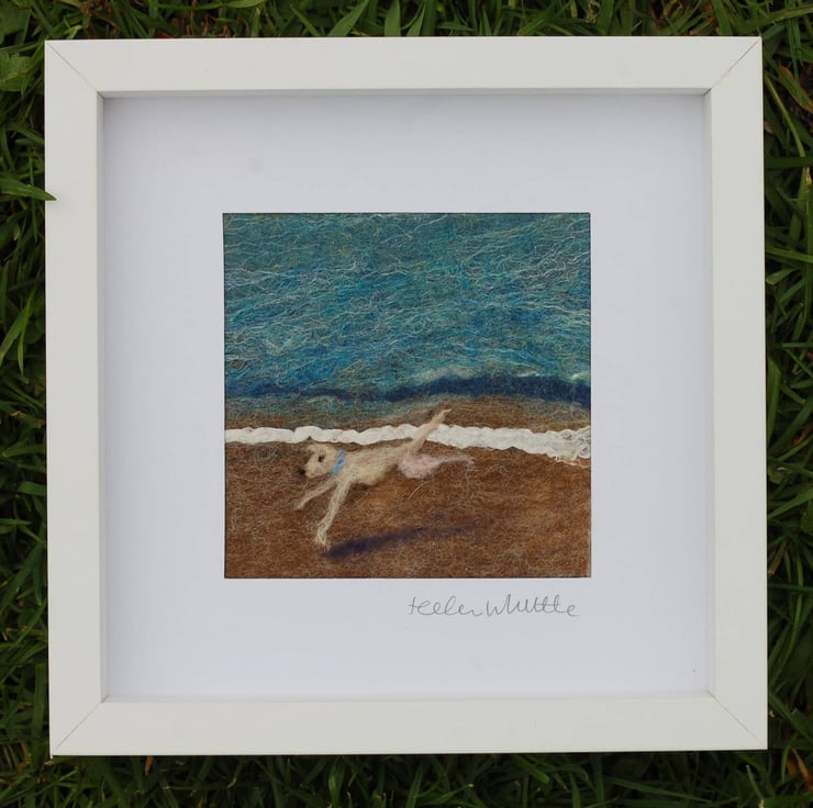 Original felted art of a pale leggy dog having fun on a beach, it could be a Weimaraner, a lurcher, labrador or Heinz 57 ! It is designed and signed by the artist.