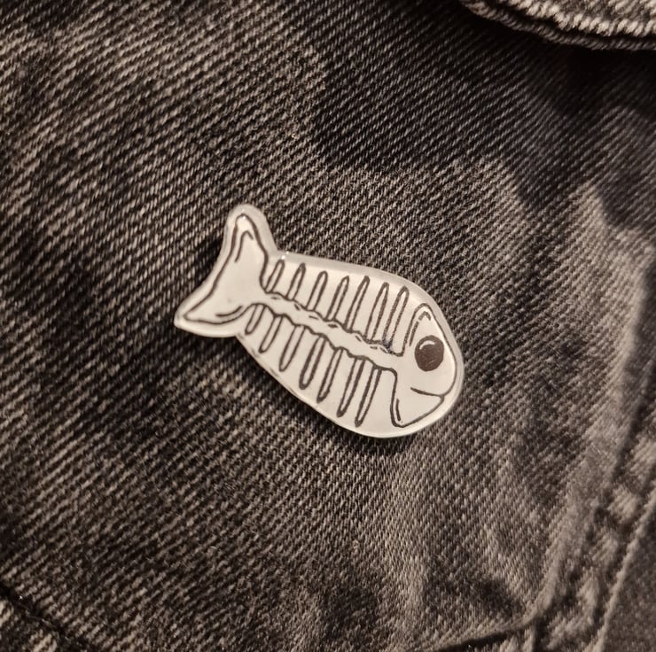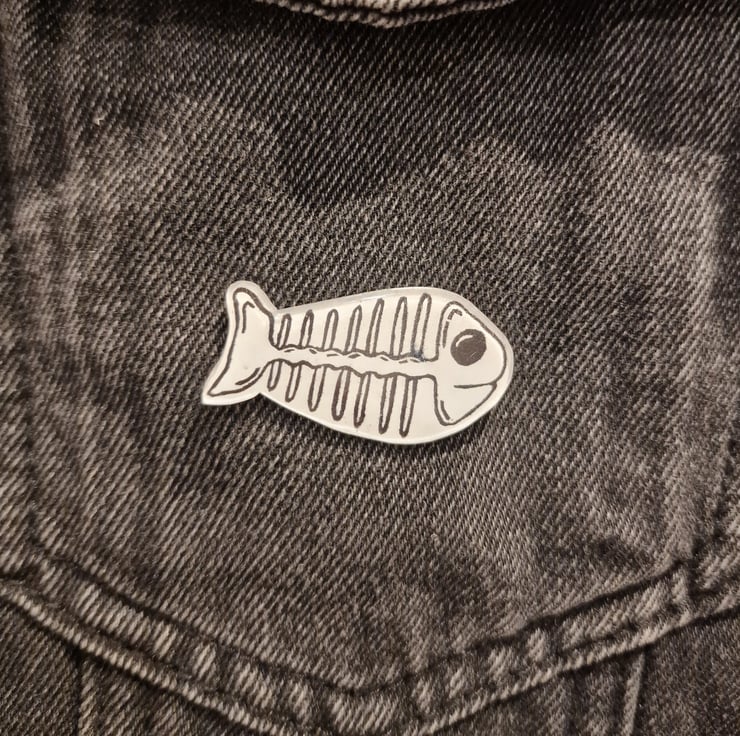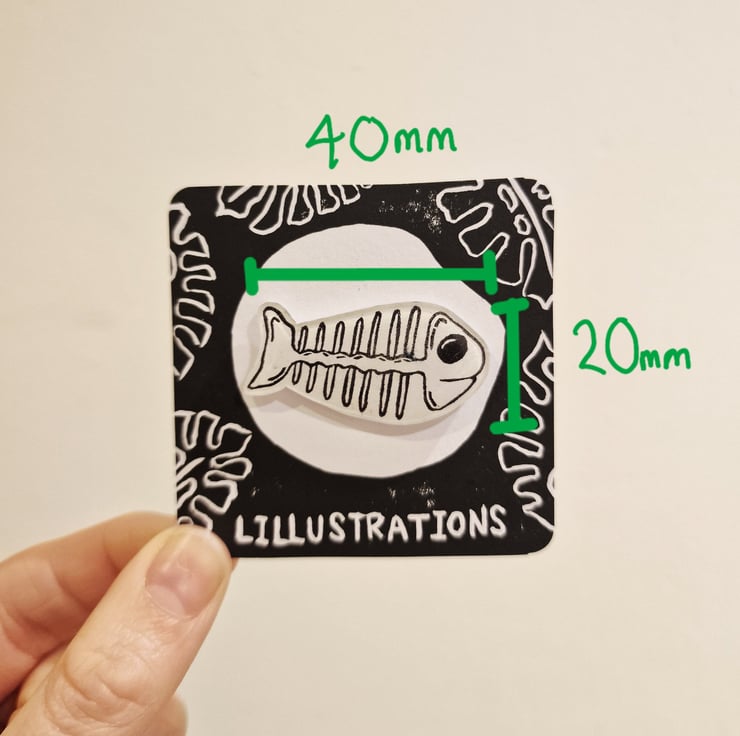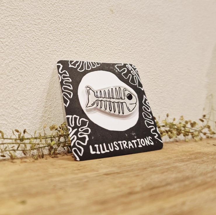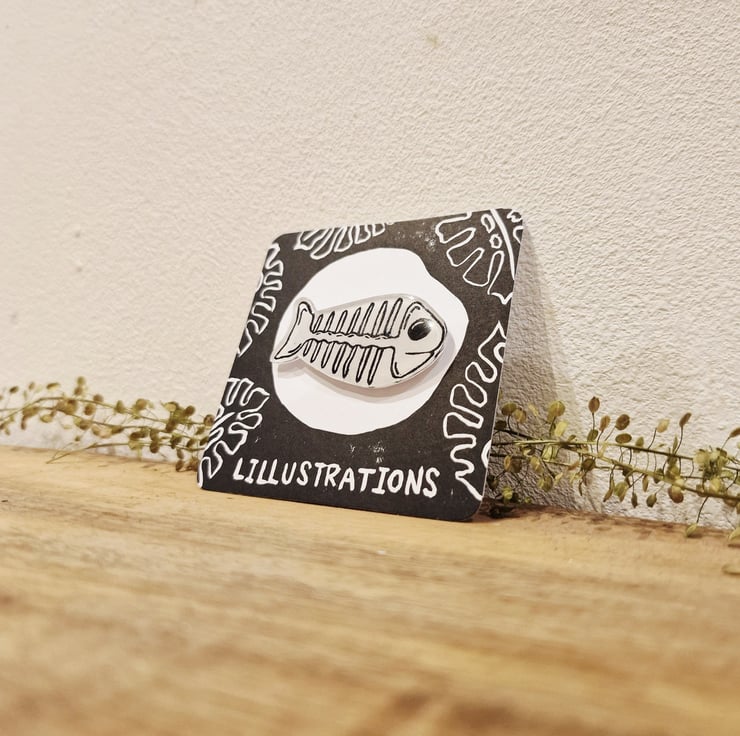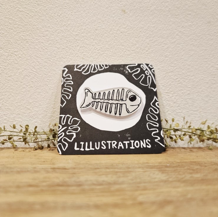 Lino Printed Fish Skeleton Pin Badge - Hand made by me, Lillustrations.