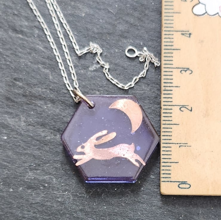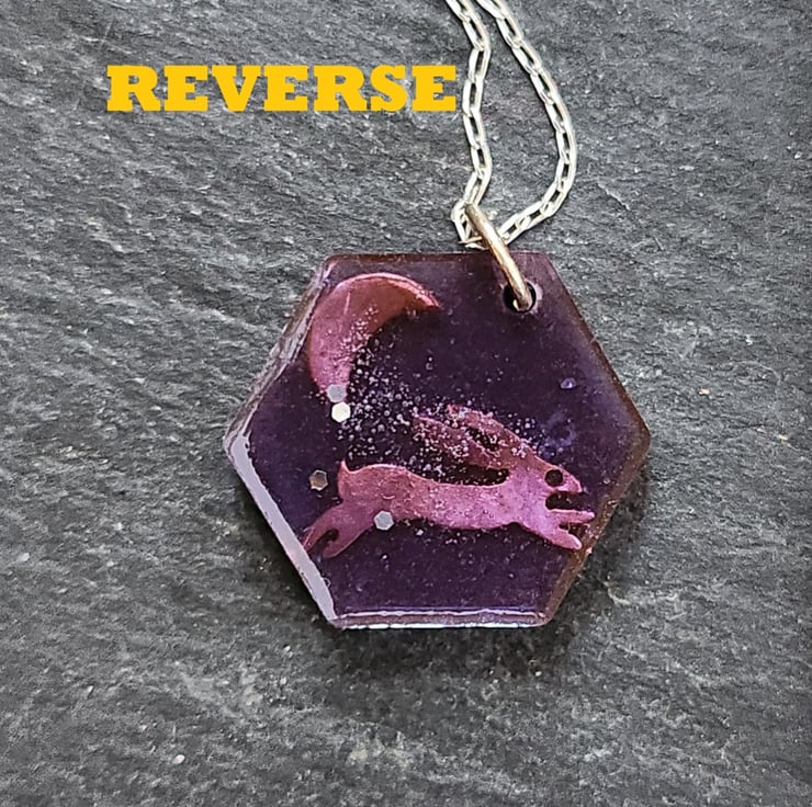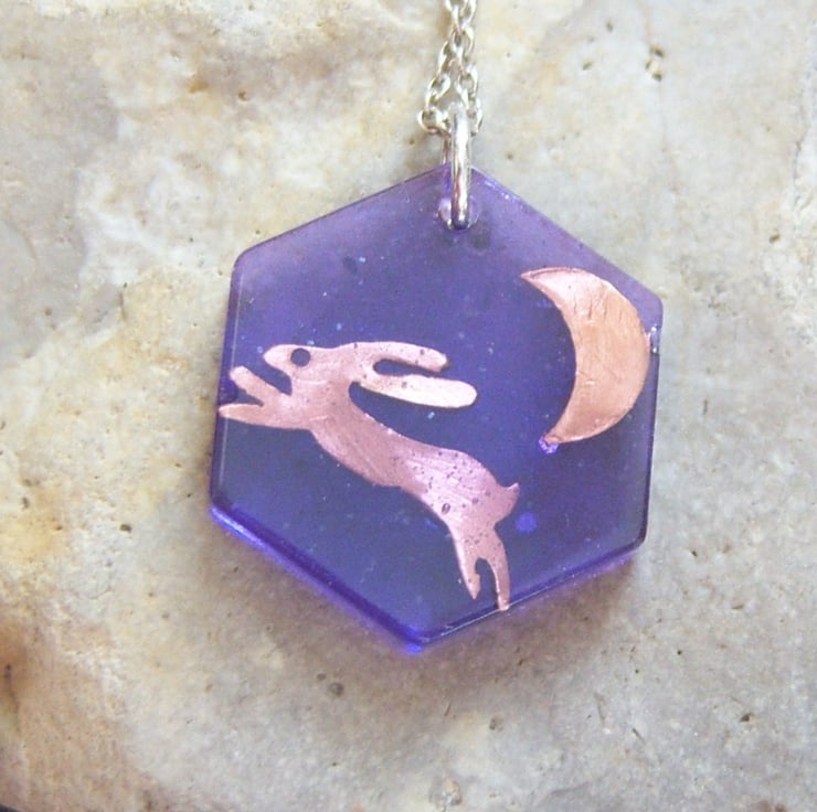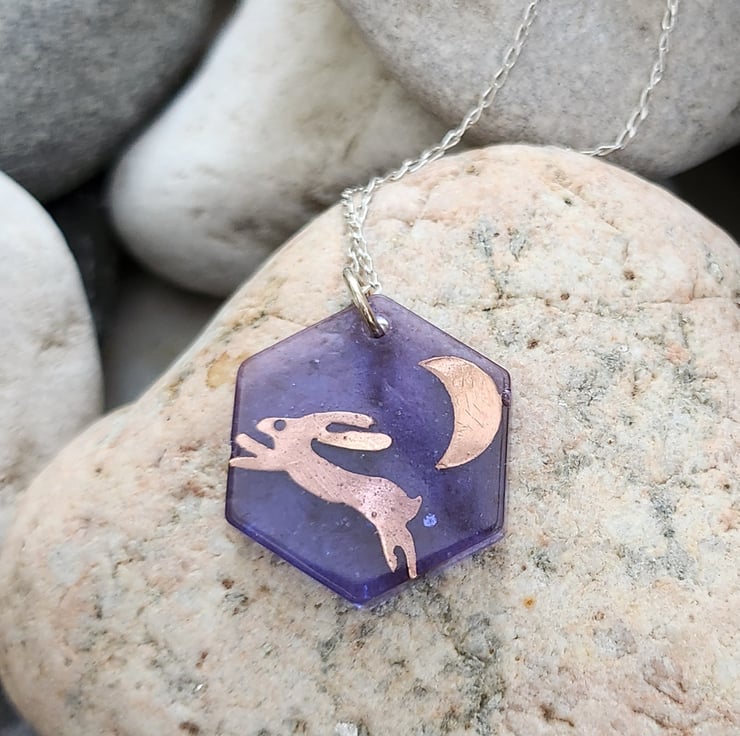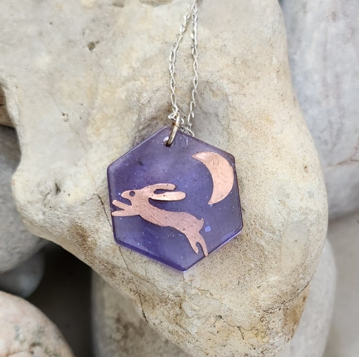 A purple coloured resin pendant, encasing a handpierced copper hare and moon. Measures 2.5 cms from point to point of the hexagon shape. There is a tiny bit of glitter to represent the stars in the night sky. Finished with a sterling silver chain, 16 or 18inch, you choose.