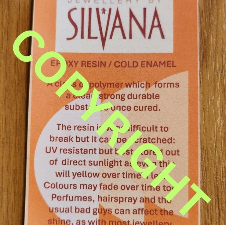 FYI - Epoxy resin/cold enamel is a polymer which forms a clear, strong, durable substance once cured. It is difficult to break but can be scratched and though UV resistant, it is best to store out of direct sunlight when not wearing as it can yellow over time.