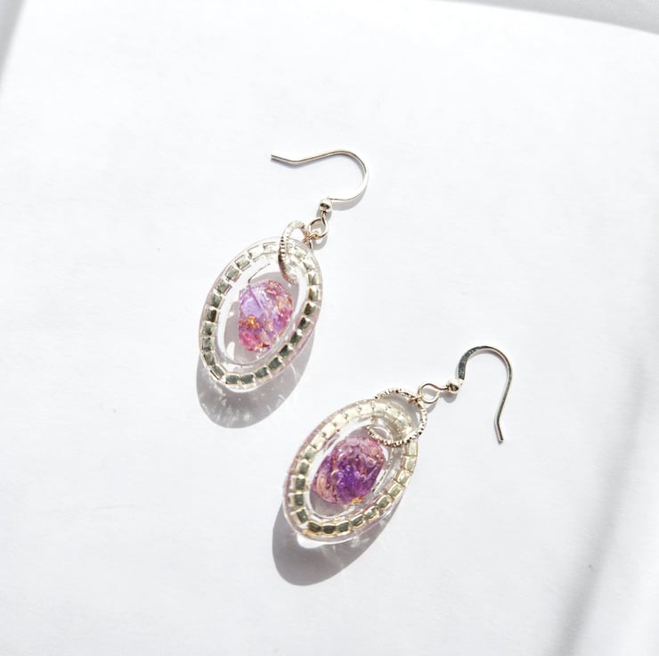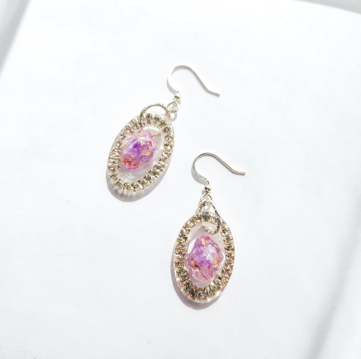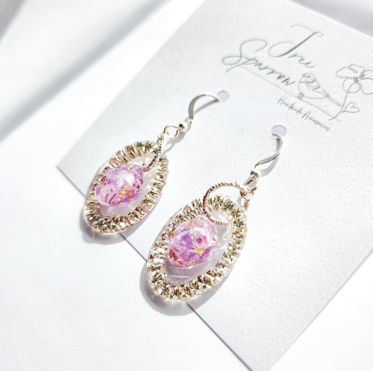 A delicate pair handmade earrings featuring real dried flowers preserved in clear resin, framed with a sparkling rhinestone border. Each piece captures a soft, romantic floral detail, enhanced by the shimmer of tiny stones that catch the light beautifully.