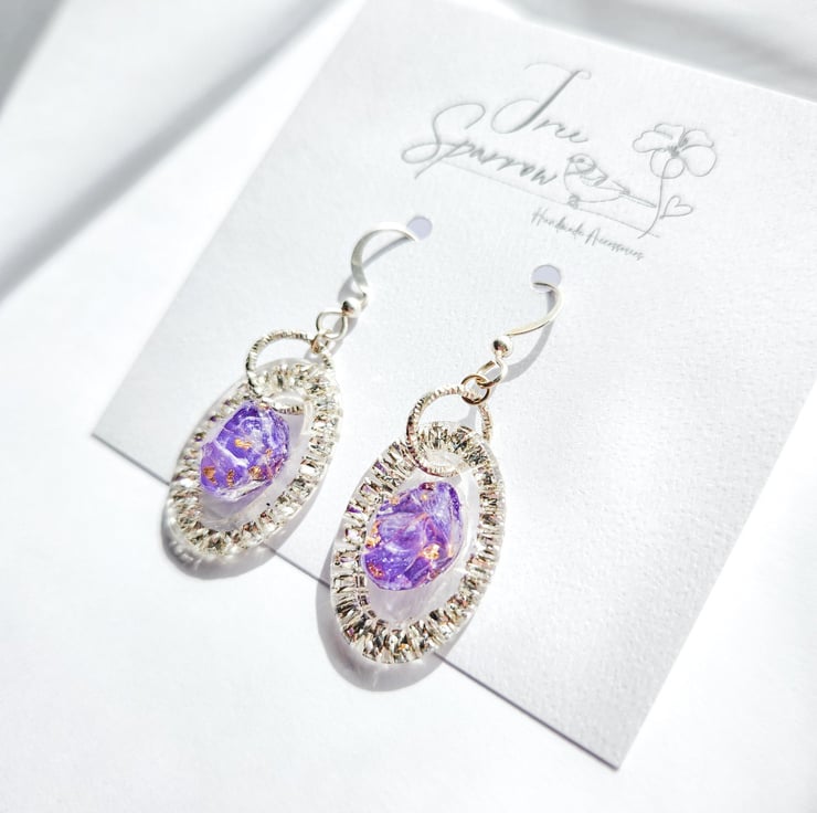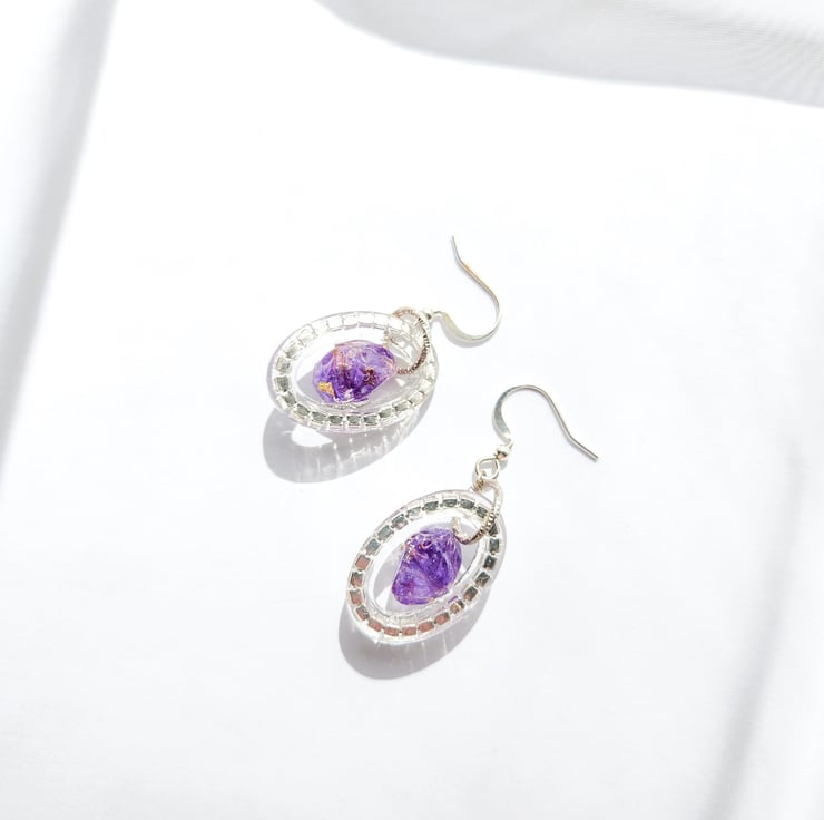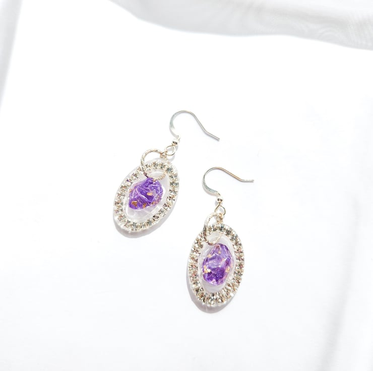 A delicate pair handmade earrings featuring real dried flowers preserved in clear resin, framed with a sparkling rhinestone border. Each piece captures a soft, romantic floral detail, enhanced by the shimmer of tiny stones that catch the light beautifully.