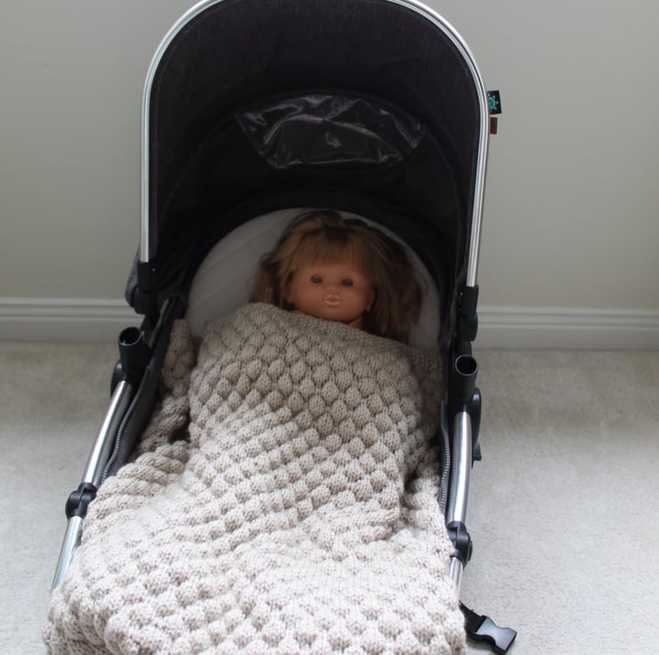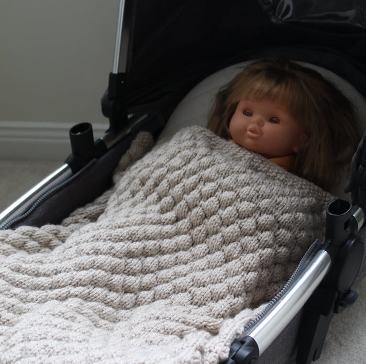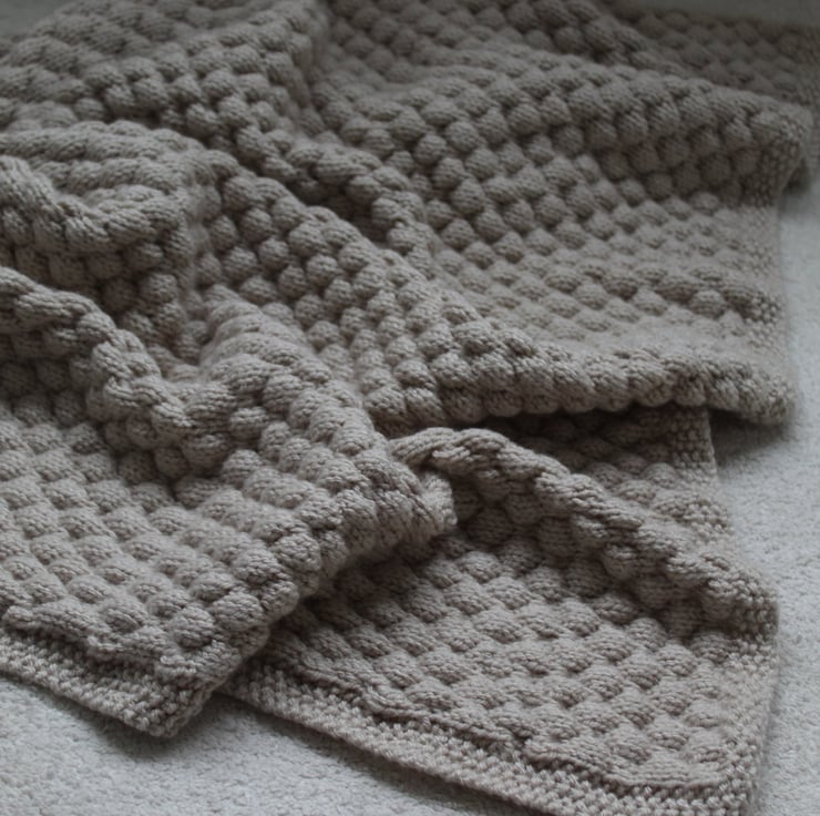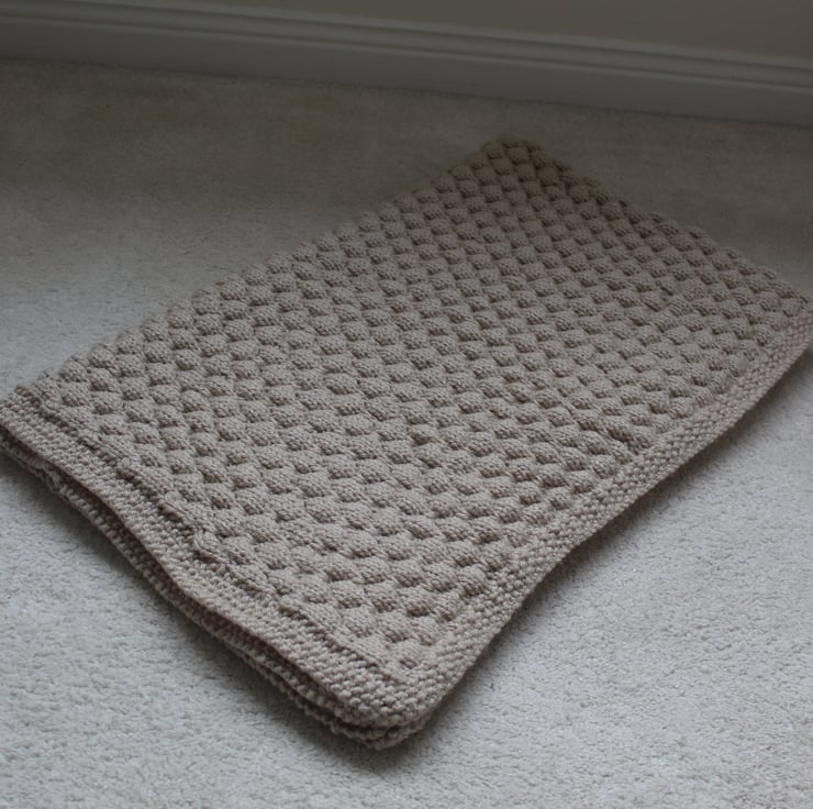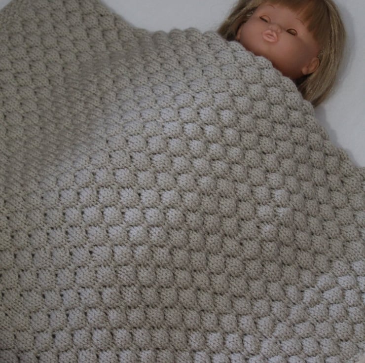 Cosy handknitted beige blanket for baby's cot, pram and car seat. Pretty bobble design. 70x120cms