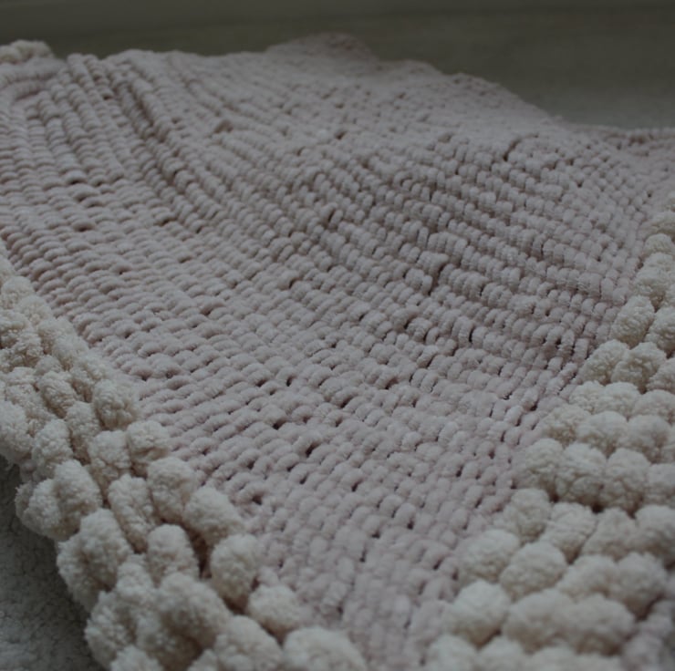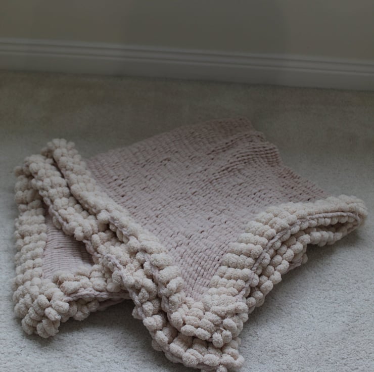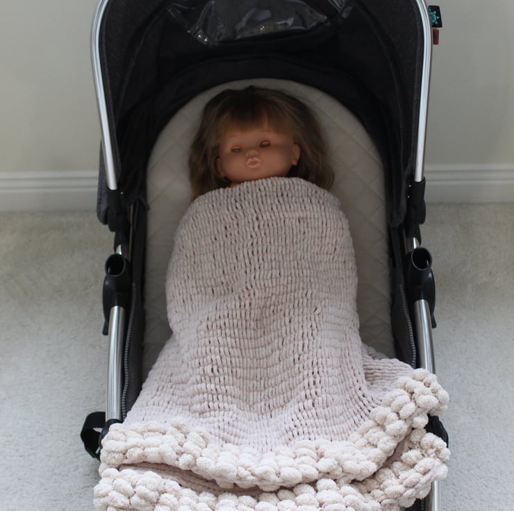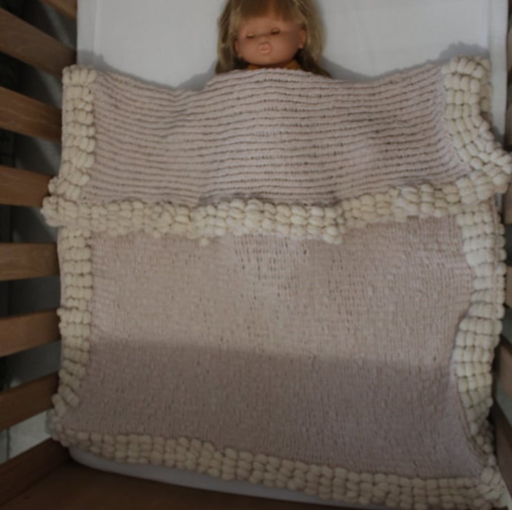 Cream Blanket for baby. Useful for cot, pram and car seat. Very soft and cuddly. Trimmed with pompom feature. 80x90cms. Machine washable 30 degrees.