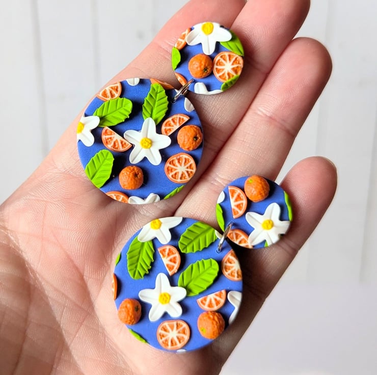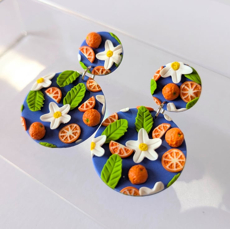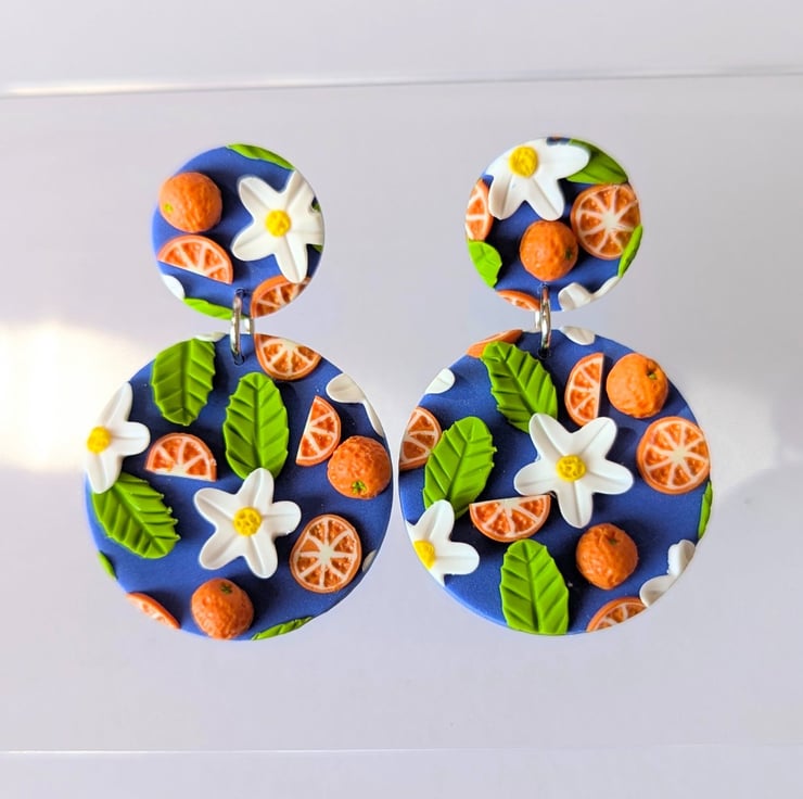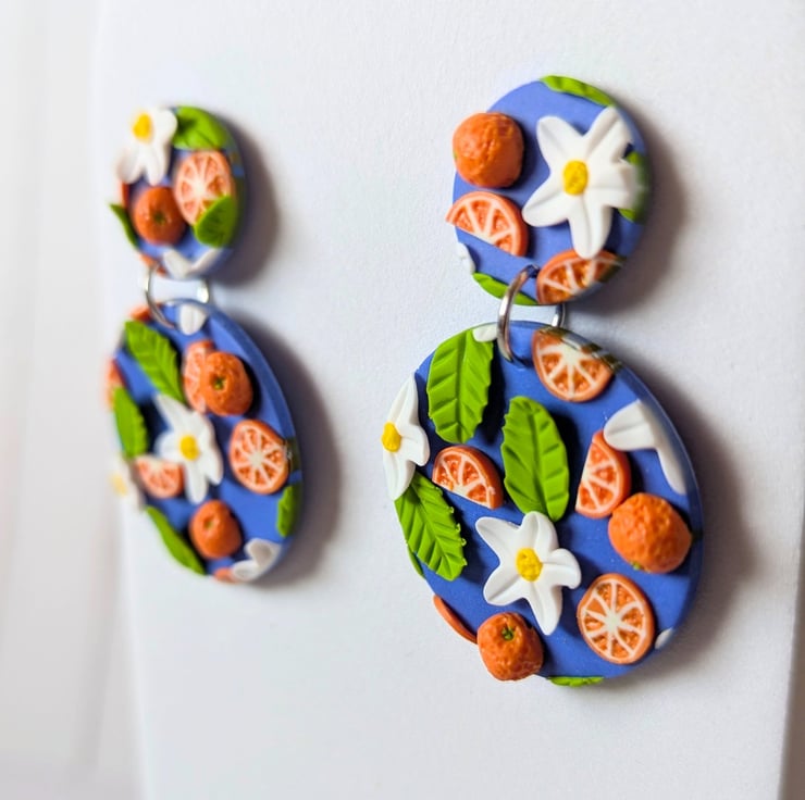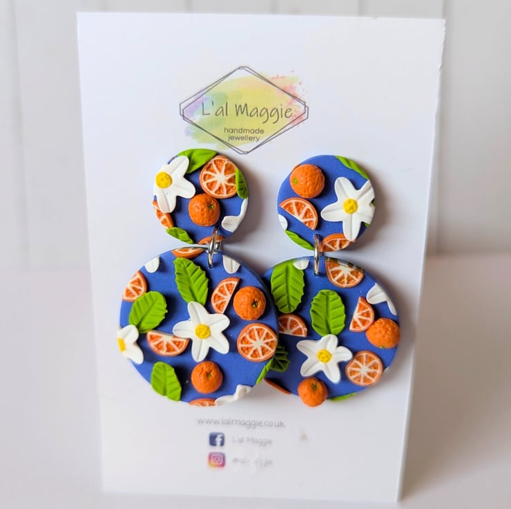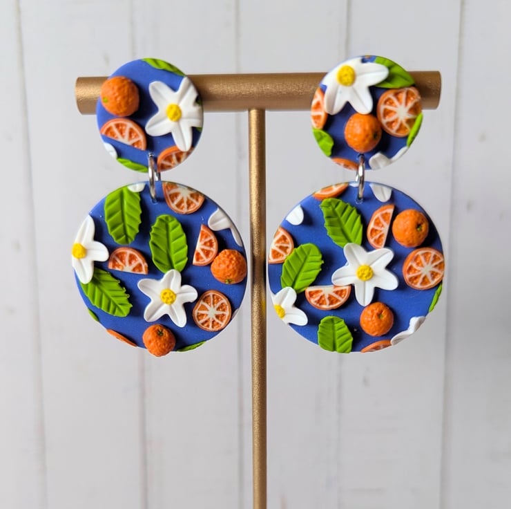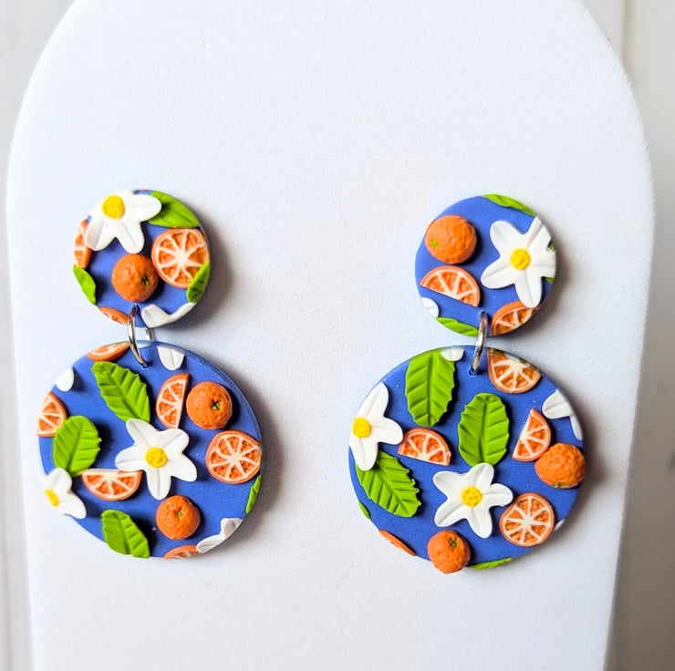 These orangery double drop earrings are bright and cheery, they have white flowers, leaves, tiny oranges and slices. They hang from a stud top with a stainless steel post.