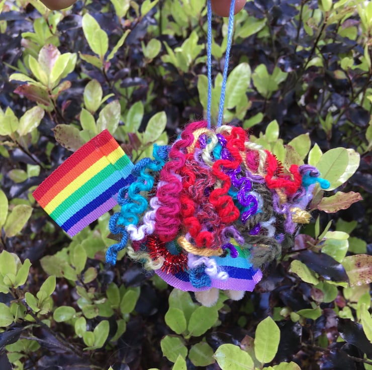 She has a rainbow dress, and curly rainbow wool hair.