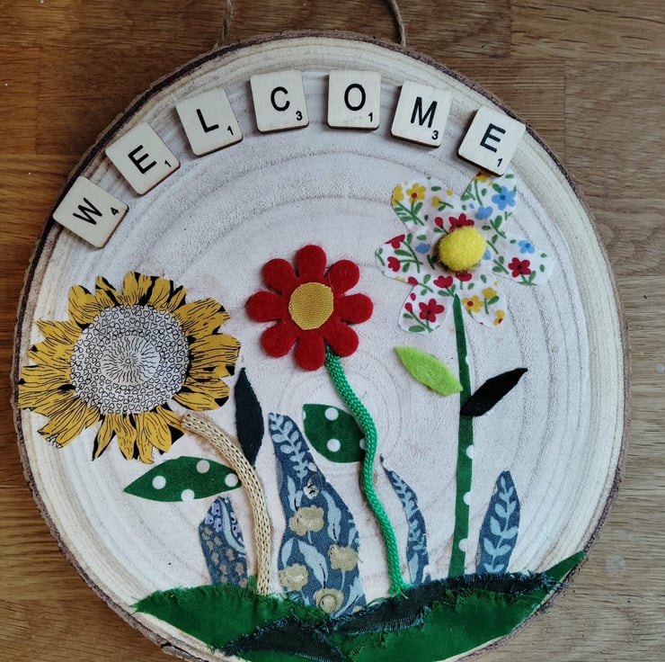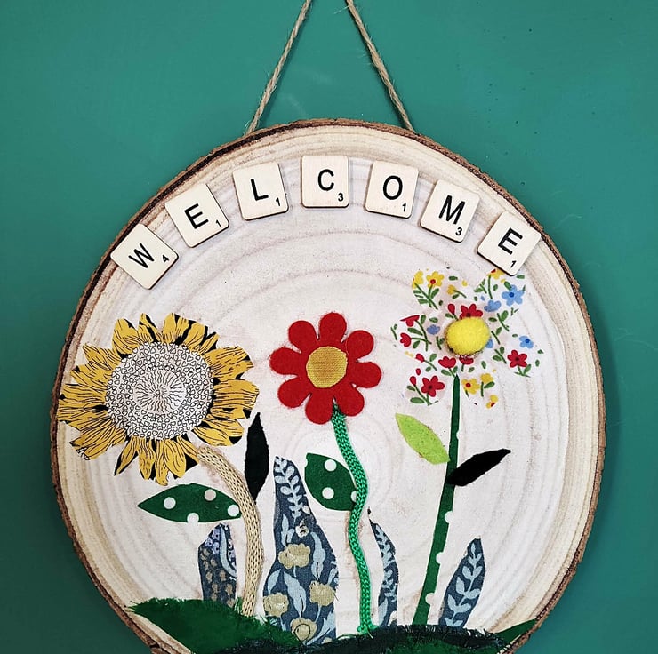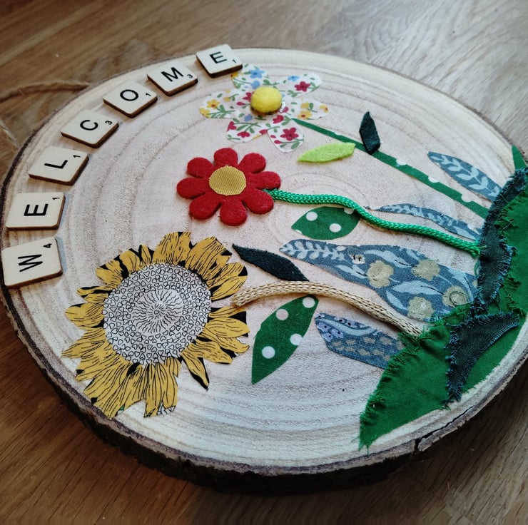 The picture is made using a mix of different fabrics and patterns on a painted real wood slice.