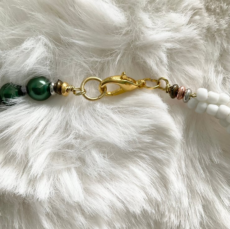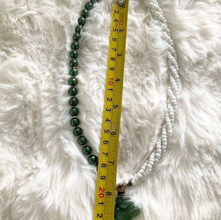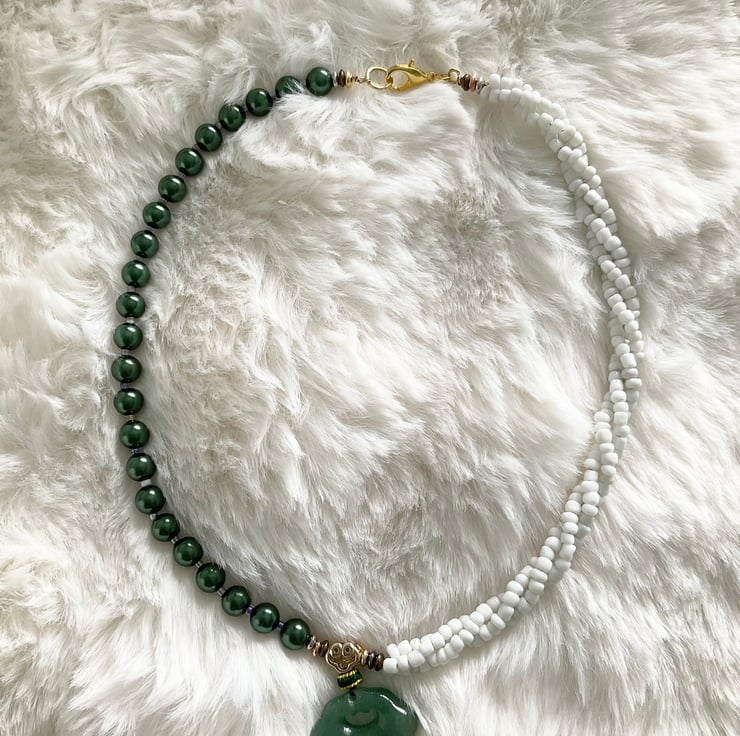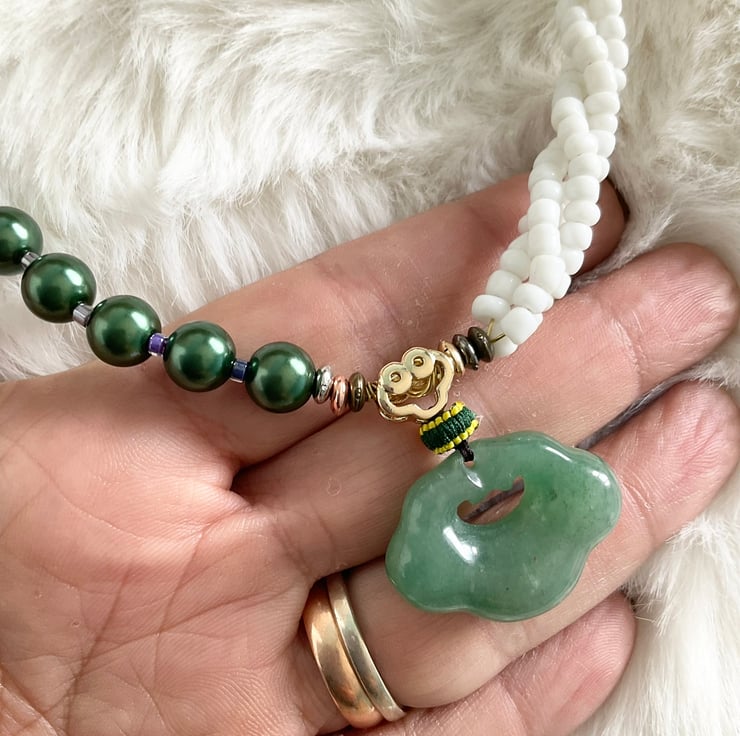 Handcrafted unique necklace featuring a natural green agate Ru Yi pendant, an auspicious Chinese symbol of luck and happiness. The pendant sets on a handmade beaded costume necklace.