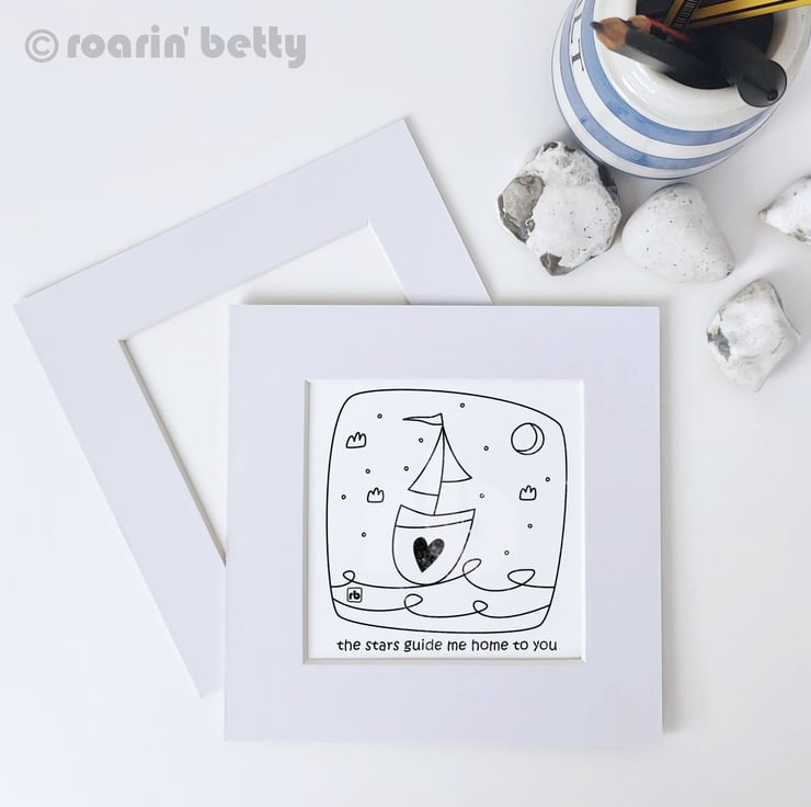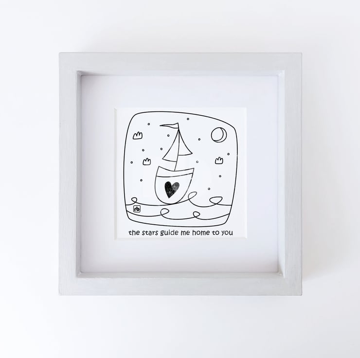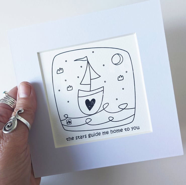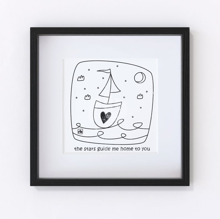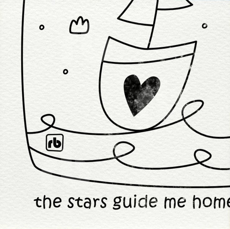Line drawing illustration of a sailing boat with the text 'the stars guide me home to you'