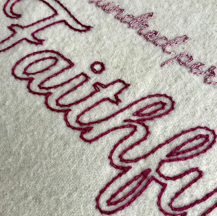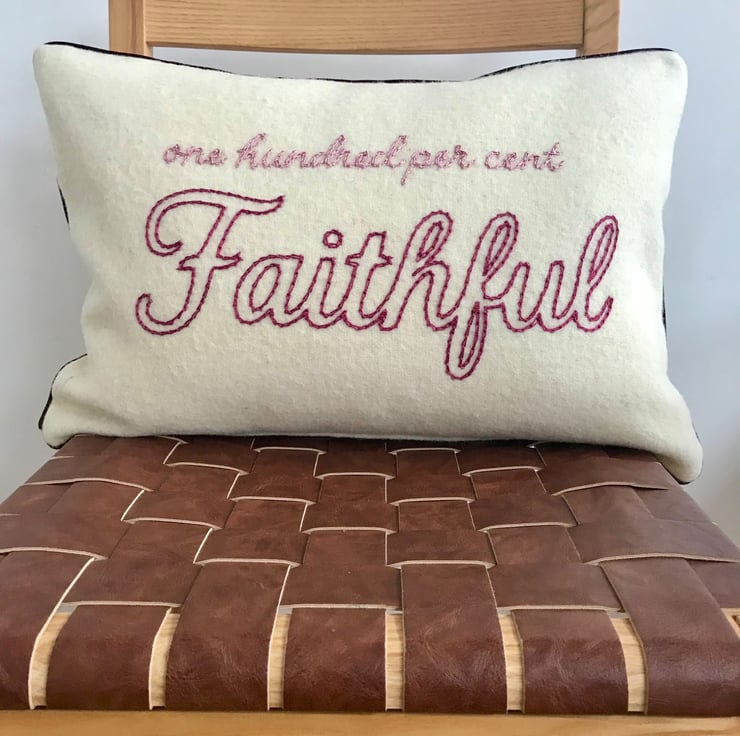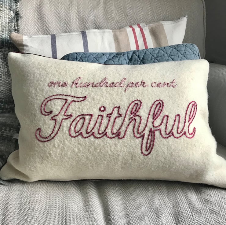 It fastens with a gold zip at the bottom and has plum velvet piping to coordinate with the two shades of pink/plum that have been used to hand embroider the words "one hundred per cent Faithful"