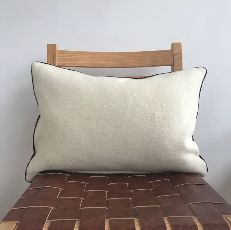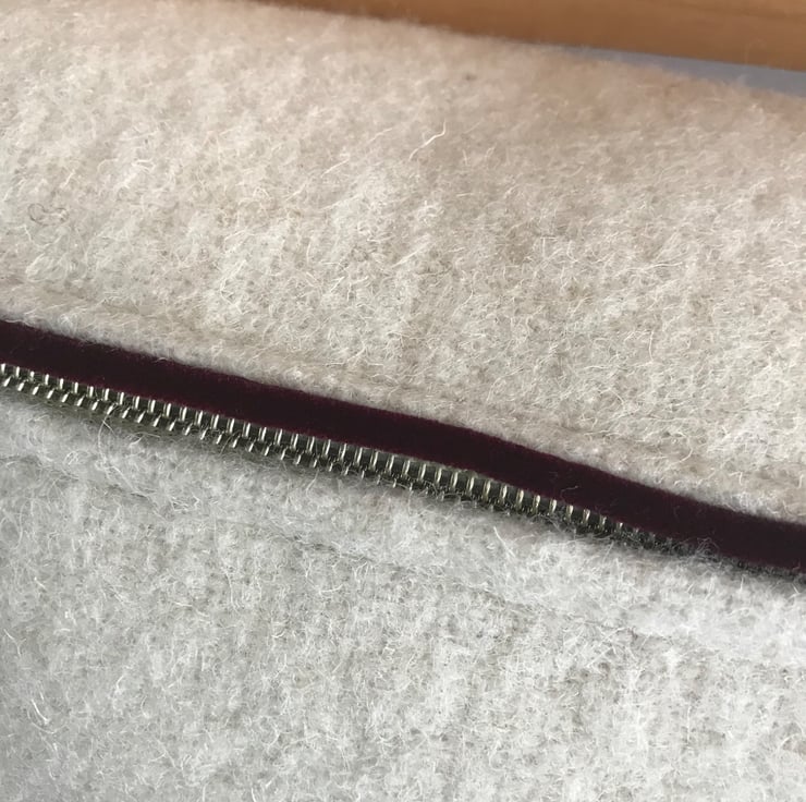 The cream wool fabric has been reclaimed from a vintage pure wool blanket; the embroidery thread, zip, piping and feather inner are new.