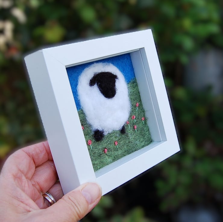 A needlefelt sheep wool picture. The sheep is standing in a field full of pink flowers. Embroidered pink flowers are scattered amongst the needlefelted green grass.