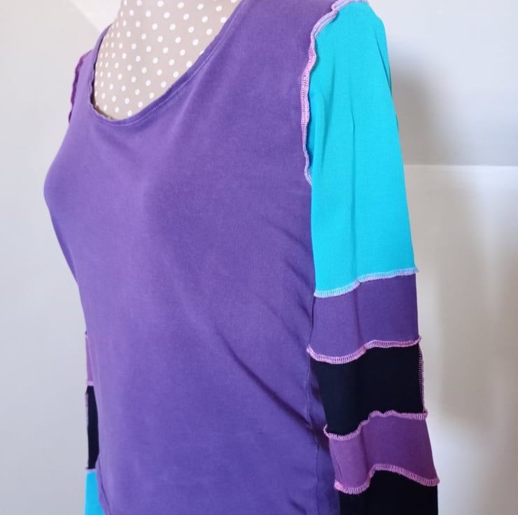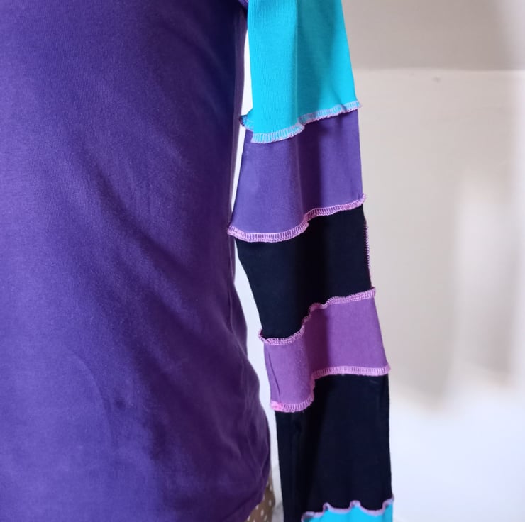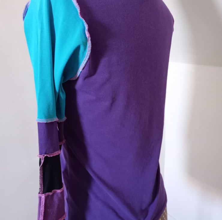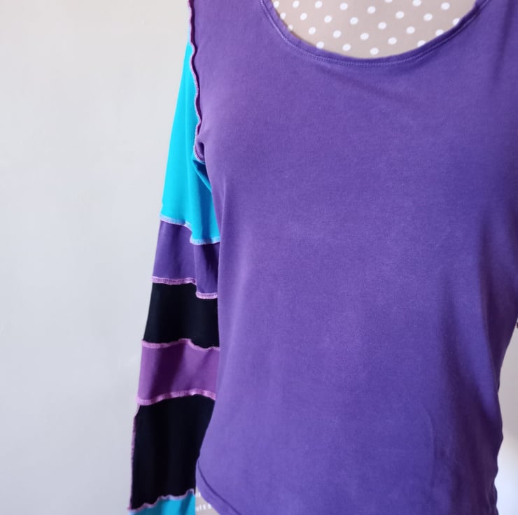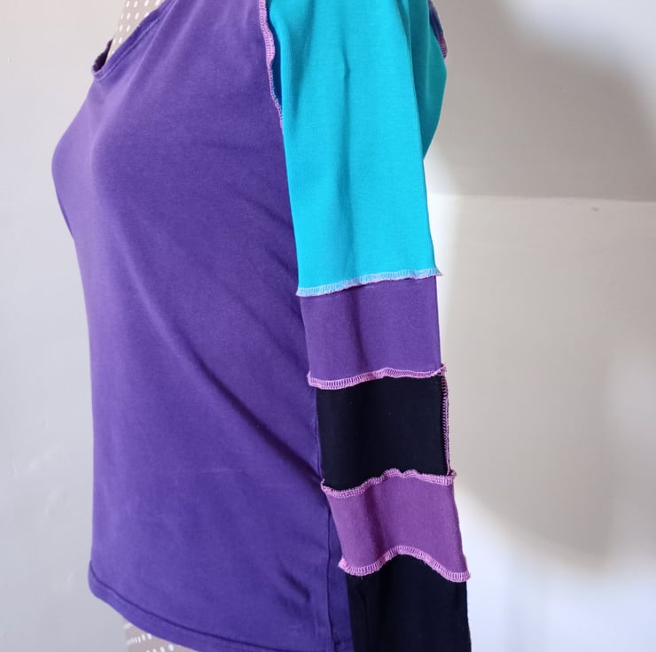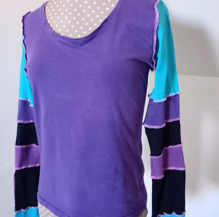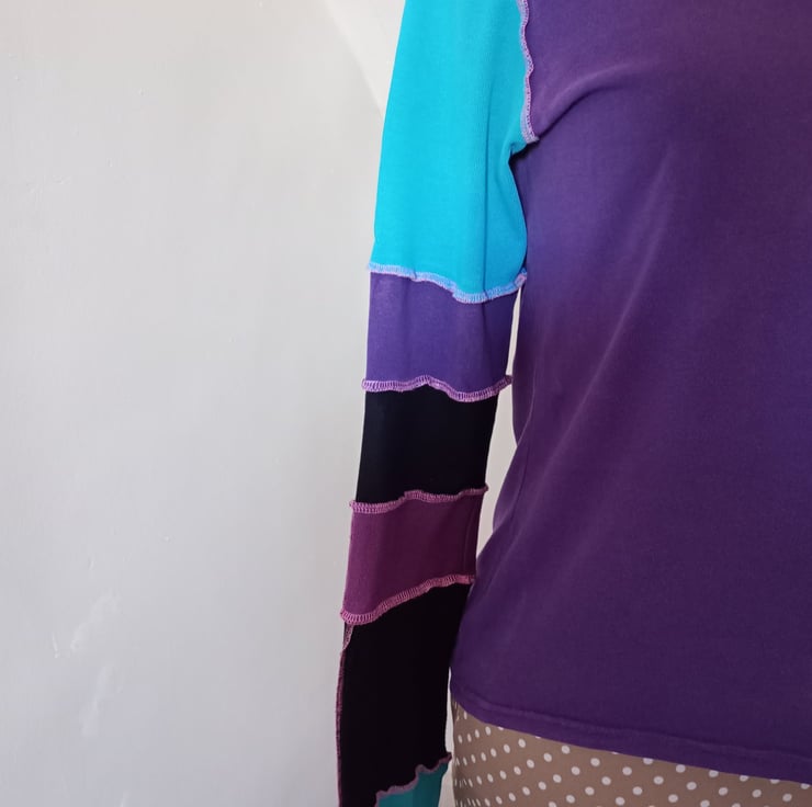This patchwork top is made entirely from preloved materials, with patchwork sleeves with funky exposed stitching.