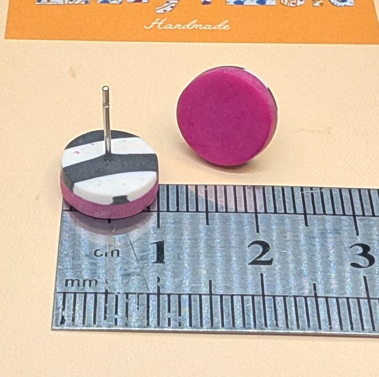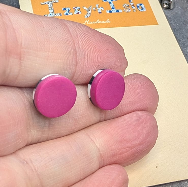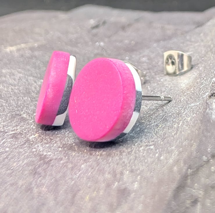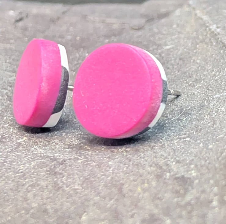 Make a bold statement with these vibrant hot pink stud earrings. They will catch the eye with their solid colour front, these earrings hide a stylish secret, there is a subtle artistic pop of monochrome stripes on the reverse side. Perfect for those who like a clean minimalistic look with a twist of personality.