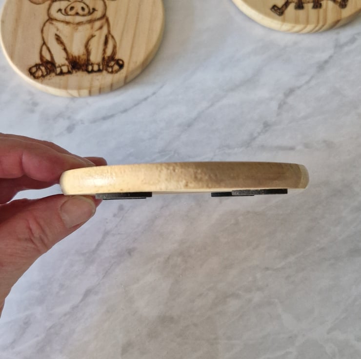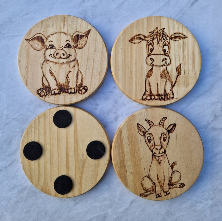 A set of four farm animal coasters, hand drawn and hand burned using a pyrography pen making each set unique and a perfect gift.