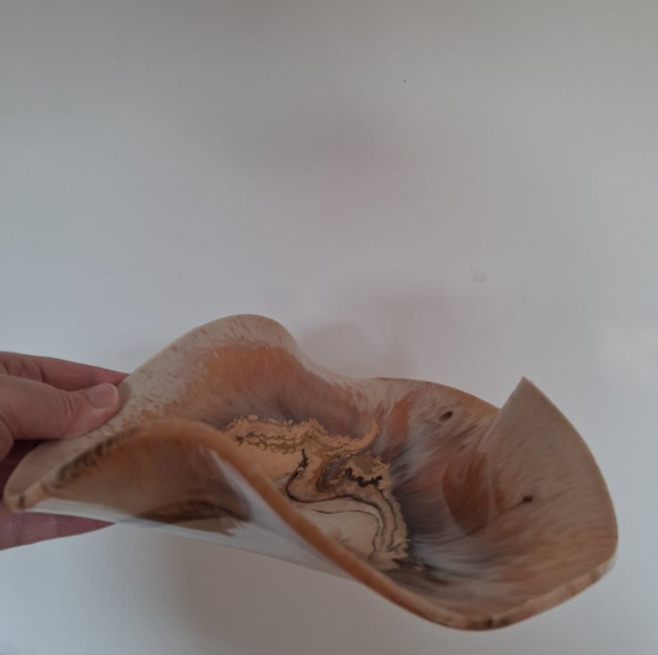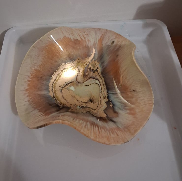 Handmade epoxy resin decorative bowl in shades of gold, bronze and cream.