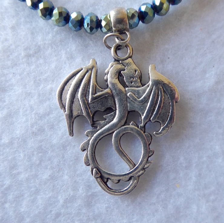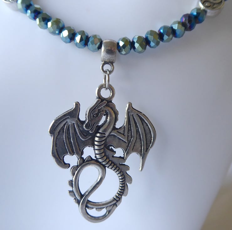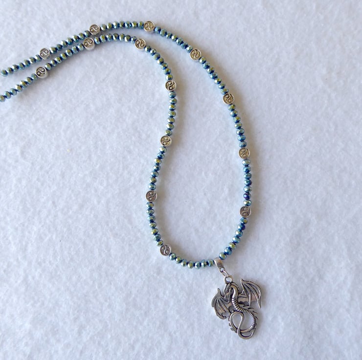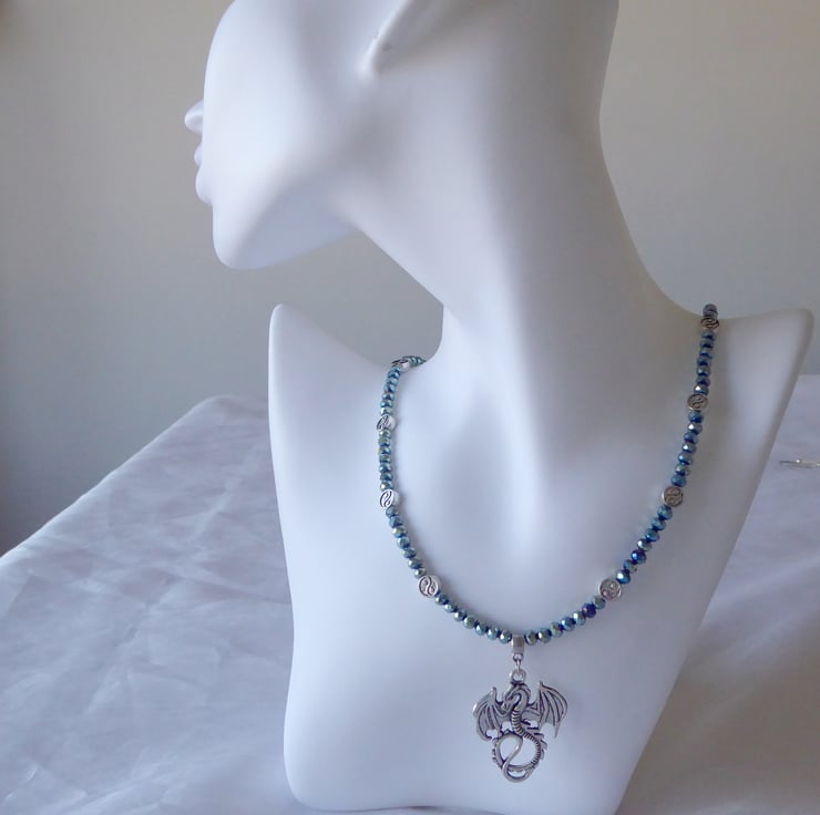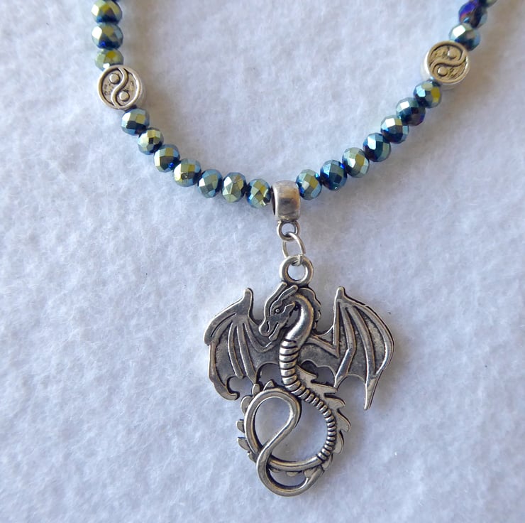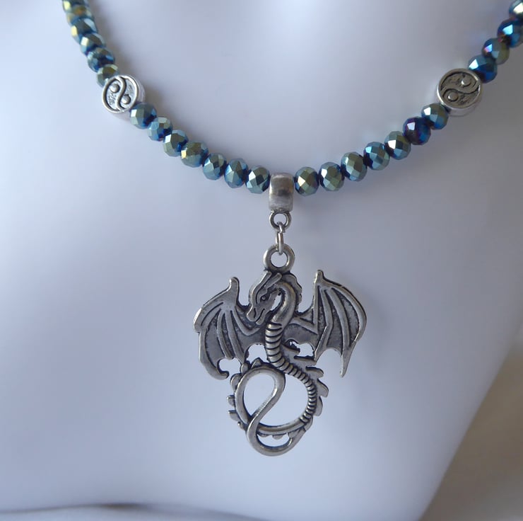 Blue-Green Faceted Bead Necklace with Dragon Pendant