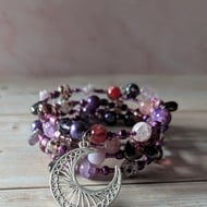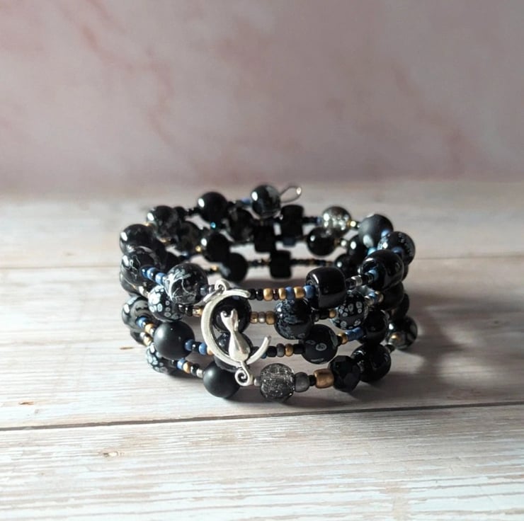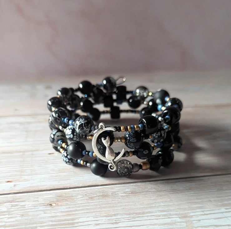 Embark on a midnight stroll with "The Midnight Familiar." This multi-wrap memory wire bracelet is a chic, nocturnal blend of textures and tones, featuring a graceful silver-toned cat perched upon a crescent moon.