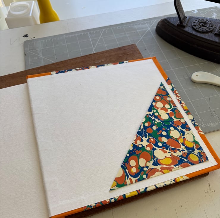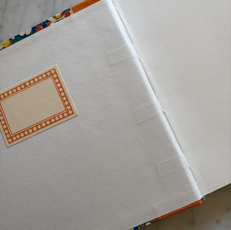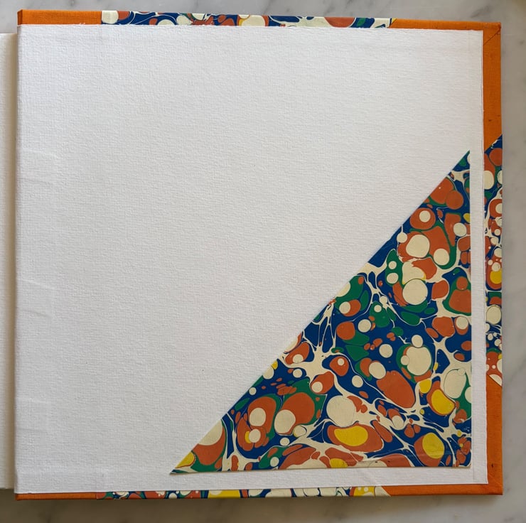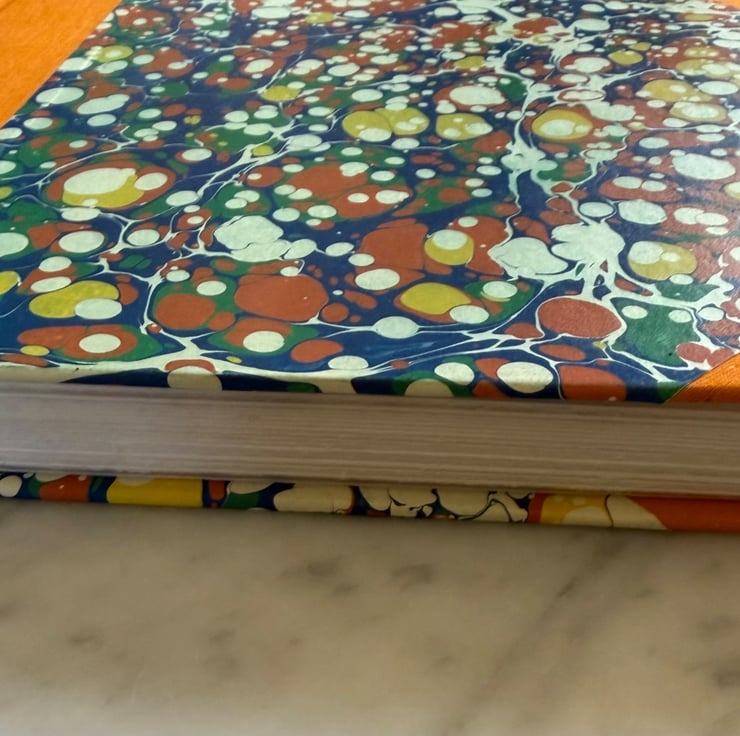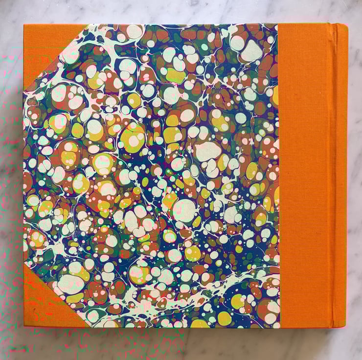 One only! Handmade, hand stitched, half bound sketchbook with 92pp watercolour paper (225 gsm, NOT finish). This one covered with a fantastic multicolour hand marbled paper by Jemma Lewis Marbling. Spine and corners in a complementary orange bookcloth. A scrap of this hand marbled paper makes a handy pocket at the back. A smart label from Cambridge Imprint inside the front cover. The marbled paper has been lightly waxed and polished.