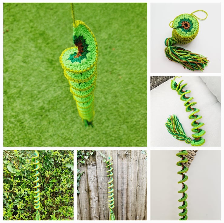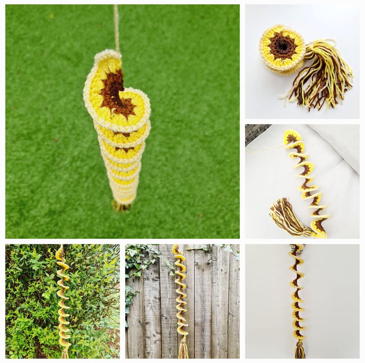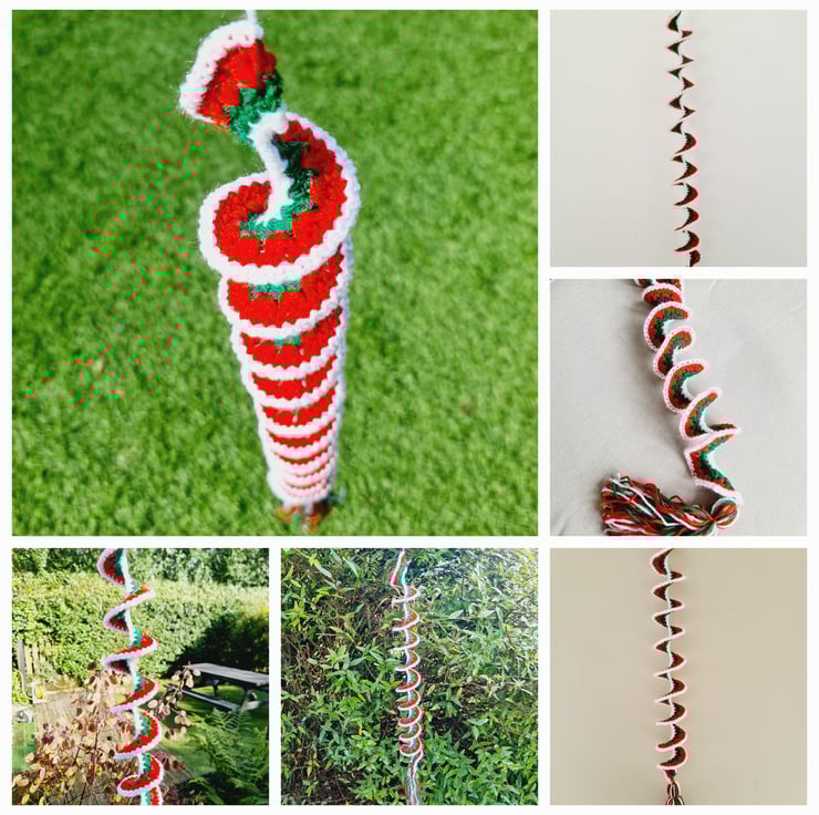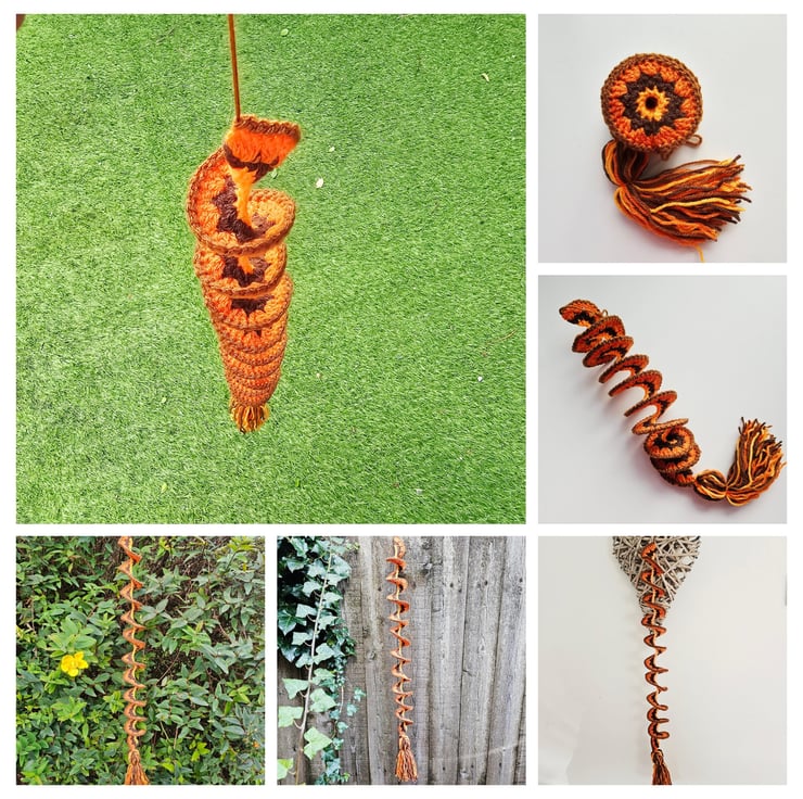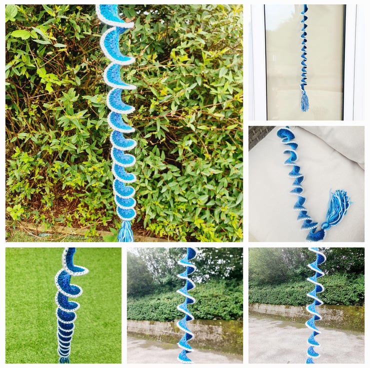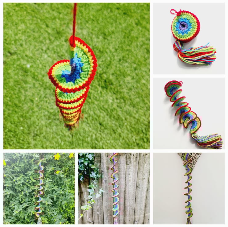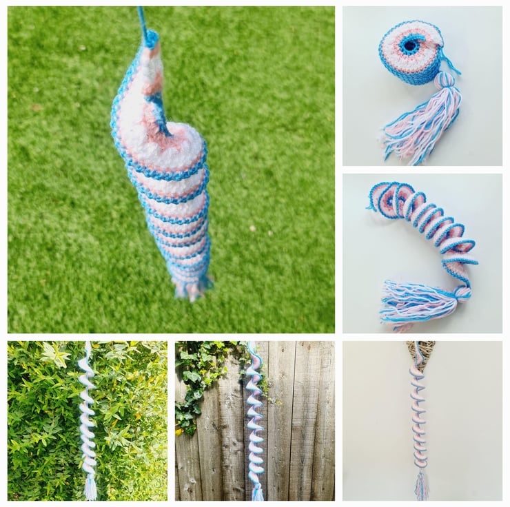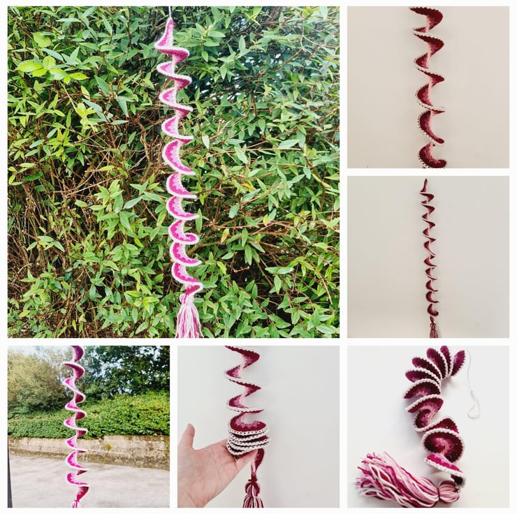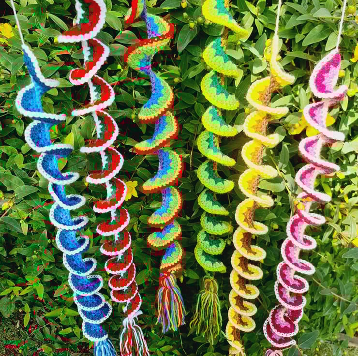 A crochet wind spinner is a decorative item, typically hung outdoors, that twists and turns in the wind, creating a beautiful visual effect. They can also be use as window hangings or general room decorations. Made in a spiral pattern, which allows them to naturally twist in the wind with a top loop for hanging and a decorative matching tassel at the bottom of each.