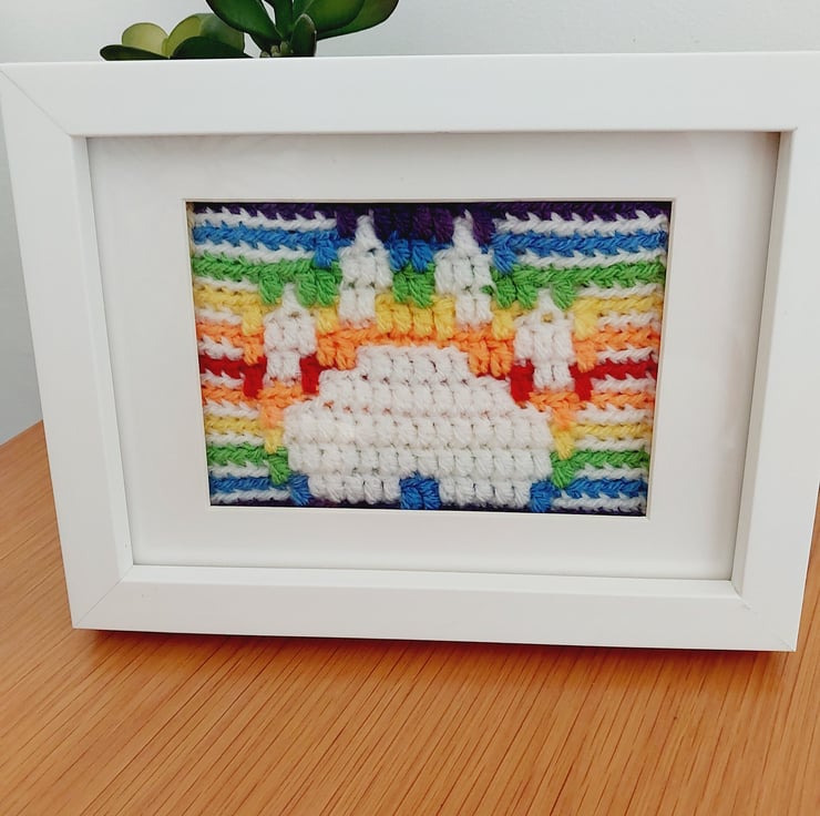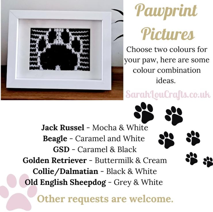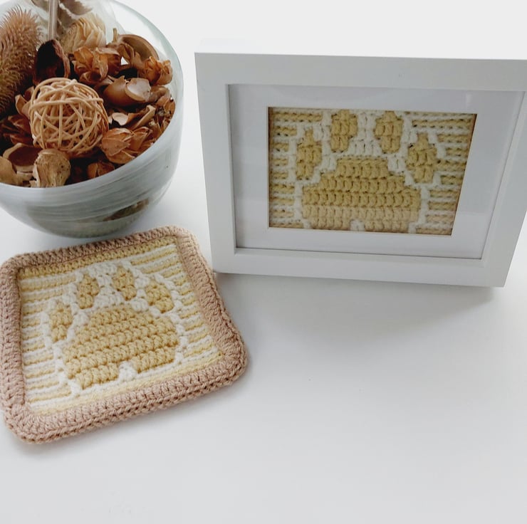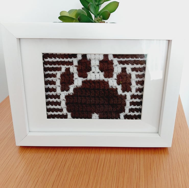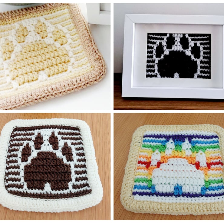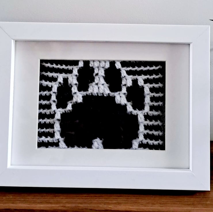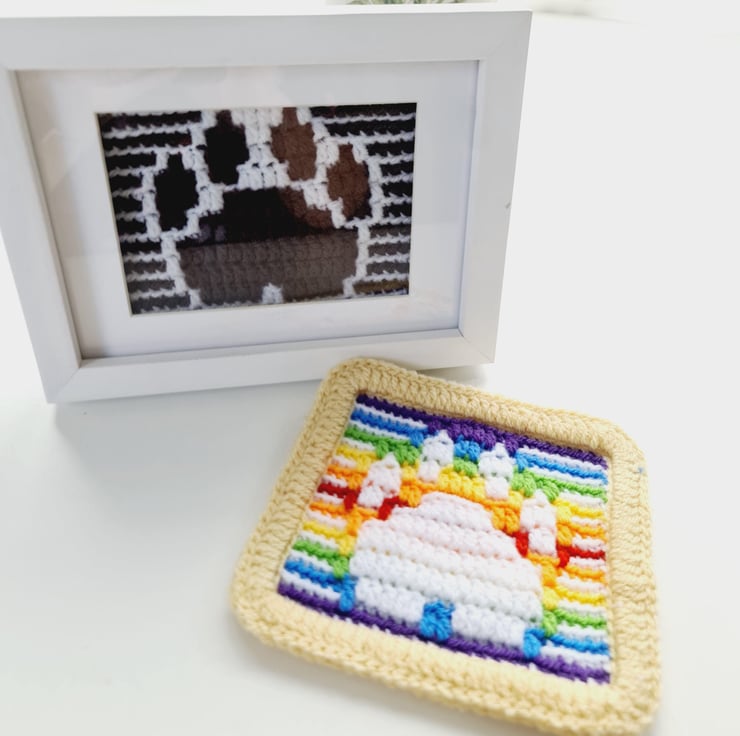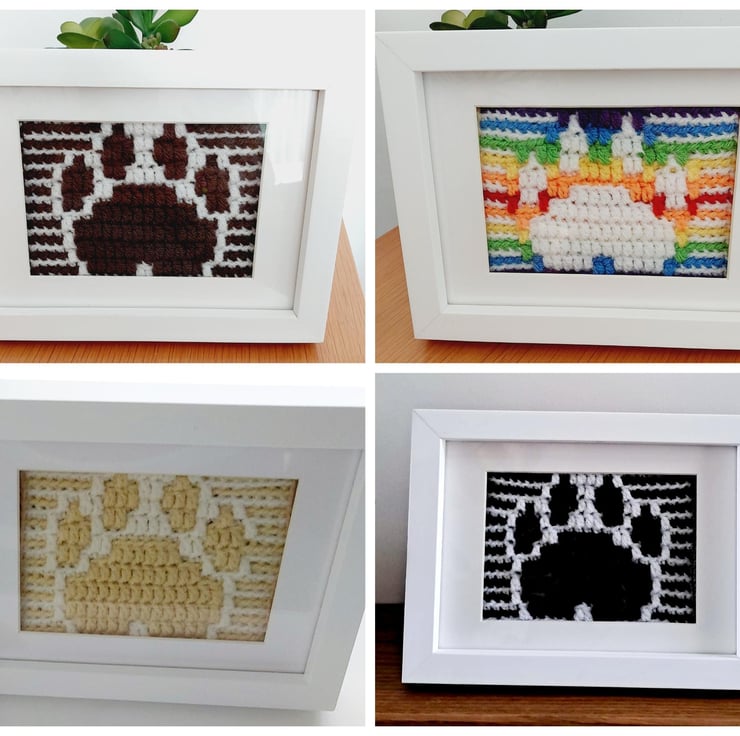 Mosaic crochet paw print pictures. Can be made in any 2 colours or as a white paw with a rainbow background to remember pets that have passed over the rainbow bridge. They can be used as paw print coasters without frame and make lovely custom dog gifts. Size of mat 13 cm x 13 cm (5 x 5 inches), size of white frame is 18 cm x 13 cm (7 x 5 inches).