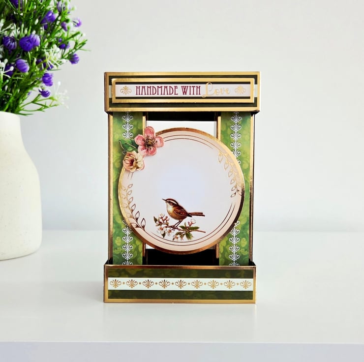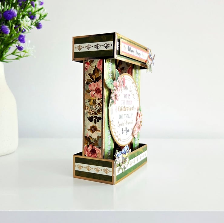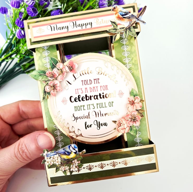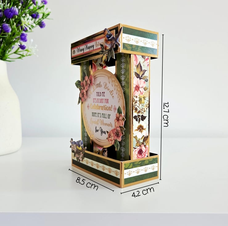 This free standing 3D card is made with high quality coated cardstock, printed with flowers and swirl borders, in the shades of green with gold foiled edges. The two columns on the left & right are connected on the top and bottom belts, to form the Tower shape. In the middle, a round topper displays the verse "A Little Birdie Told Me It's A Day For Celebration! Hope It's Full Of Special Moments For You" while the tab with the sentiment "Many Happy Returns" lays on the top belt. On the back, the round topper displays a matching image of a bird, and provides you the space for a small, handwritten message. On the top belt, the tab reads "Handmade With Love". Both sides are embellished with floral ephemera and images of birds.