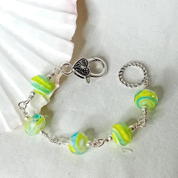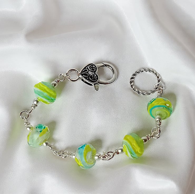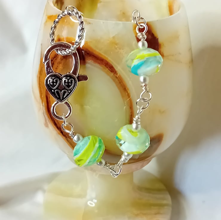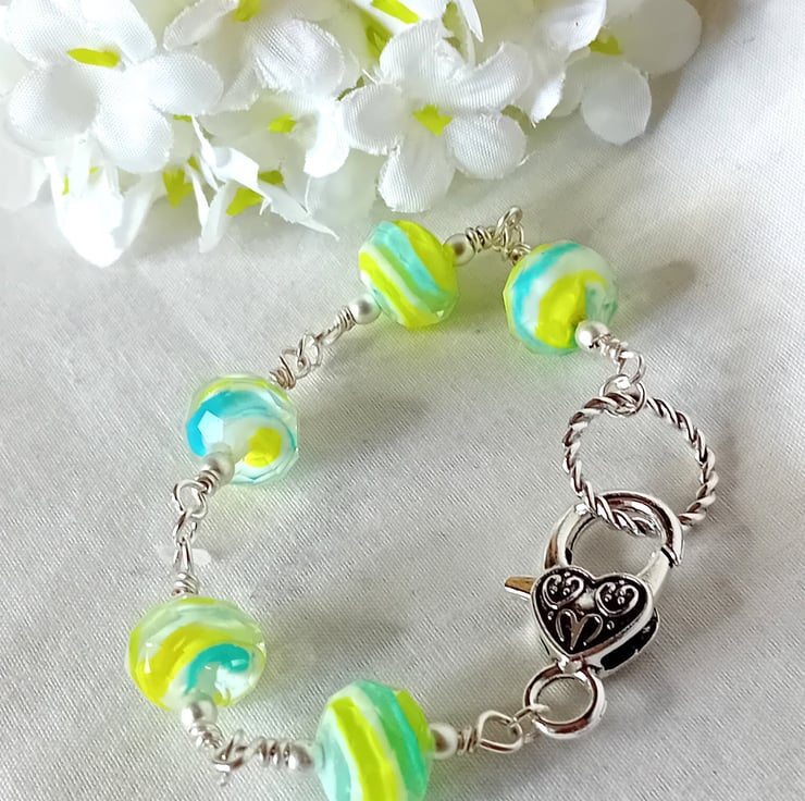 This bracelet is made with Murano Glass, handmade faceted stunning glass beads is a swirling pattern of yellow, white and a light blue, which looks green in some places. Each bead is wrapped and then connected with the next. The glass beads are surrounded with a Matte finish Silver Hematite and finished with an over sized Tibetan Silver clasp. A truly Stunning design. Comes tucked in a black faux suede bag which is great for storing as well as gifting.